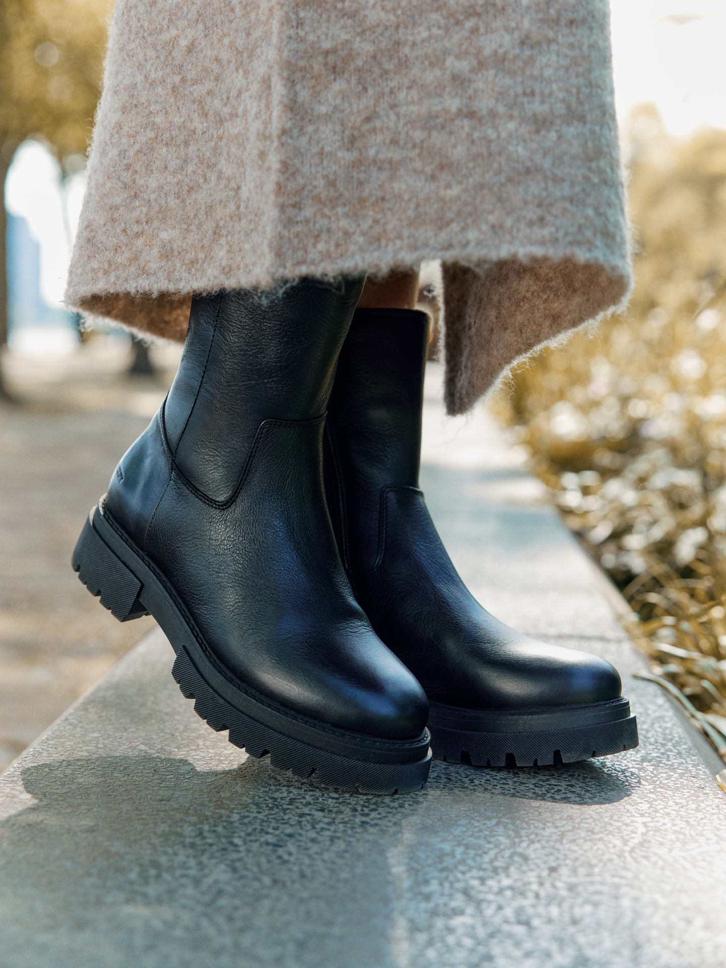 Rayana er en medium høy vinterboot fra blackstone i sort glatt skinn, tykt foret med sueskinn. Skoene har en chunky yttersåle i gummi som gir demping og godt grep. Glidelås på innersiden og hempe bak. Innersålen er uttakbar.