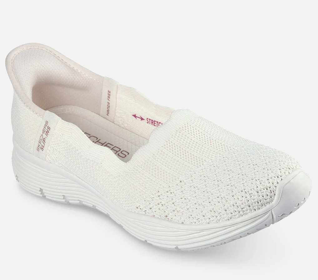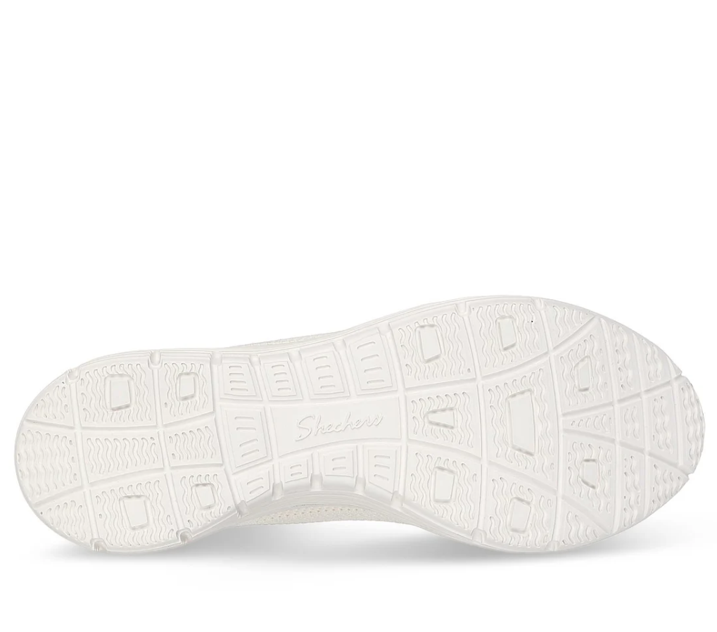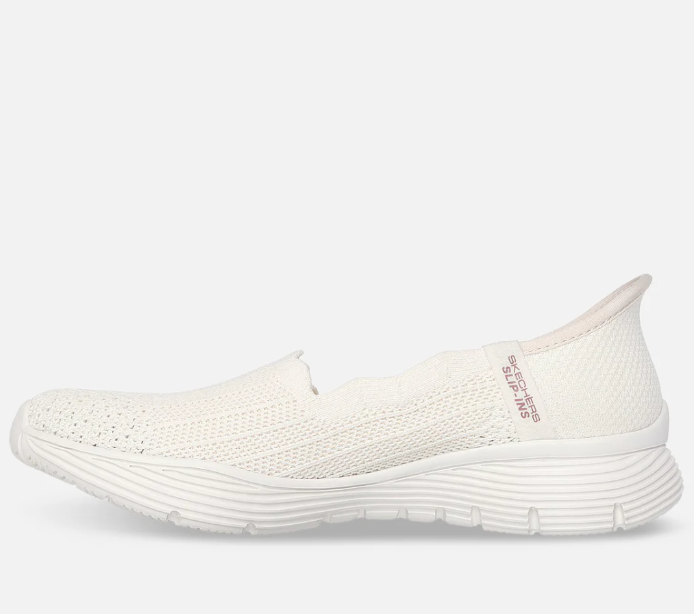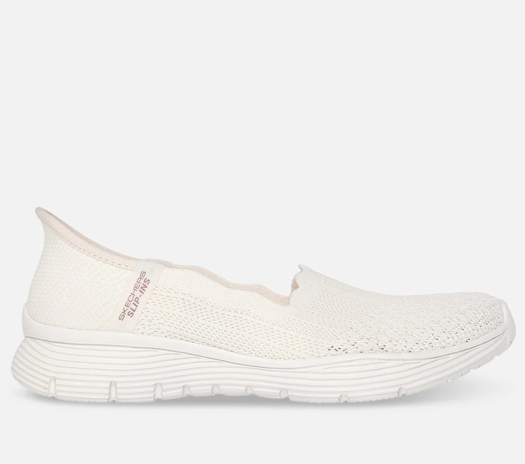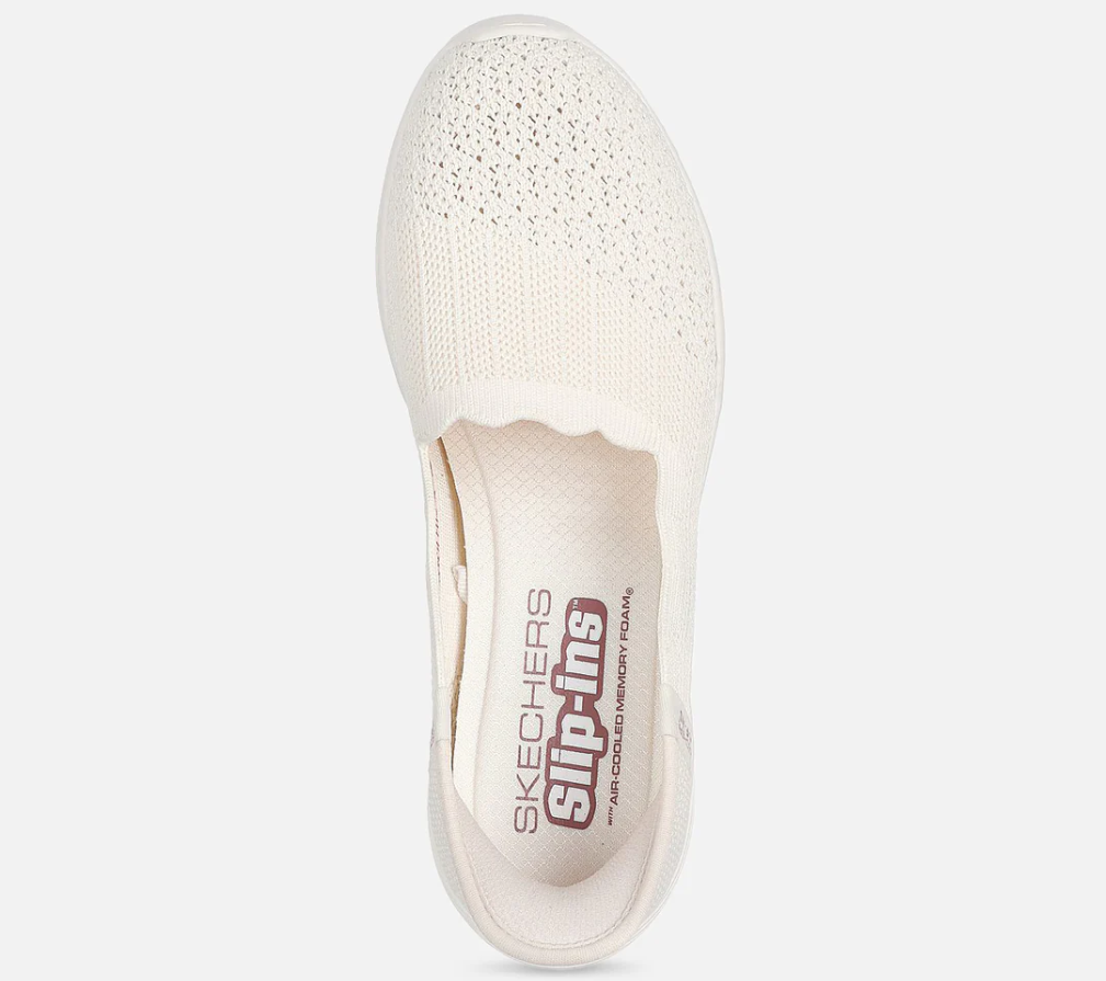 Slip in ballerinasko fra Skechers. Den stive hælkappen gjør at du kan tråkke rett ned i skoen, uten å bruke hendene. Designet med skechers Heel Pillow, som holder foten stabilt på plass. Strikket overdel med strech. Air-Cooled memory foam inenrsåle. Skechers er store i størrelsen.