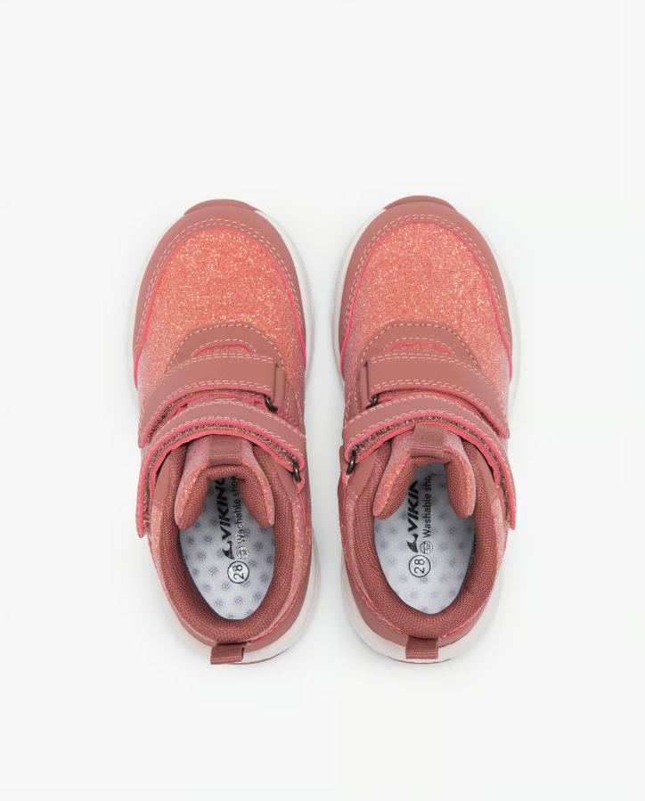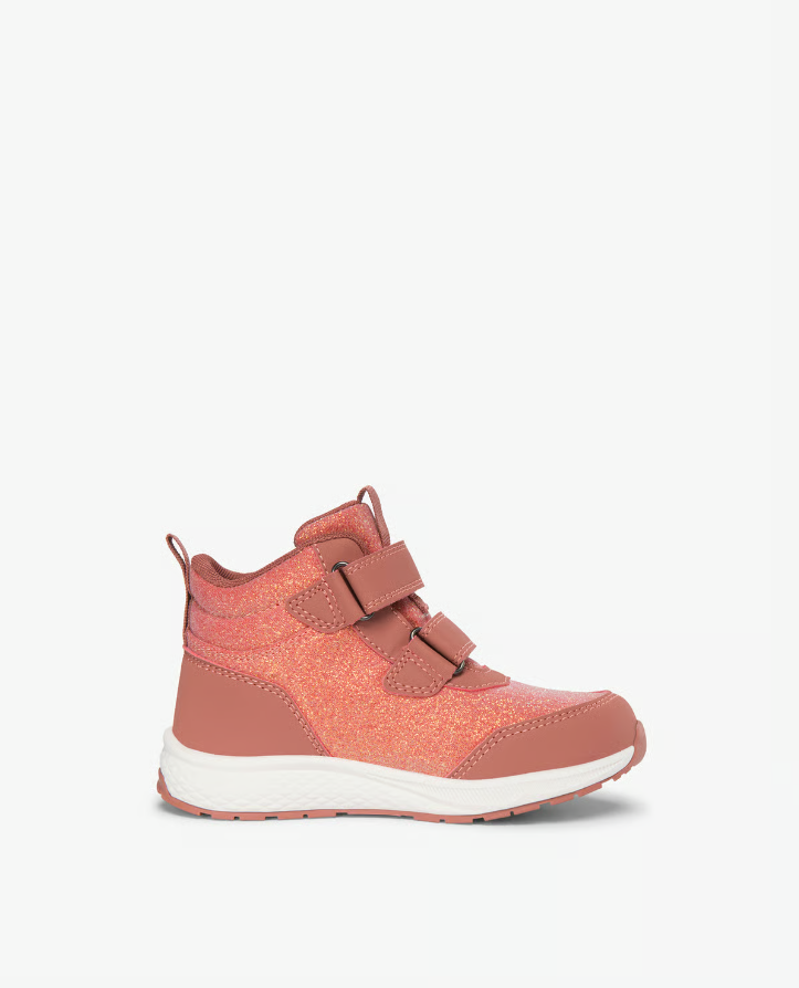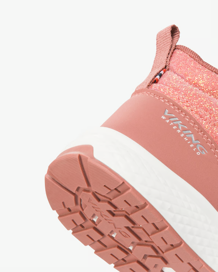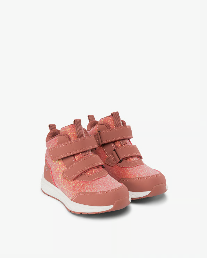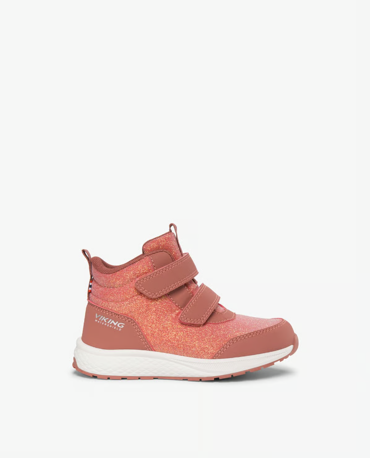 Bouncy Glitter Mid WP 2 fra Viking er en overgangssko med middels høyt skaft. Skoene har vanntett Watershield membran, forsterket overdel og doble borrelåsfester. Lett mellomsåle i EVA gir god demping mens yttersåle i gummi sikrer godt grep. Kan vaskes i maskin på 30 grader.