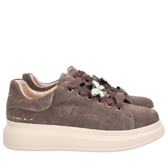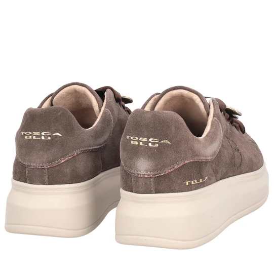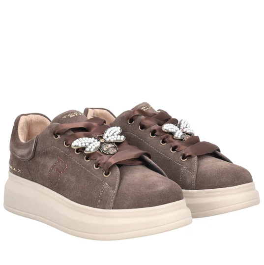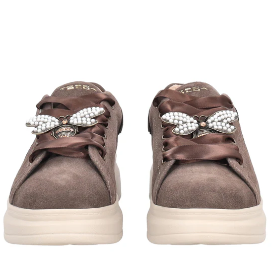Sneakers i brunt semsket skinn med platåsåler og gulldetaljer. Skolisser i sateng med et stilig bie-smykke. Satenglissene kan byttes ut med med vanlige brune lisser som medfølger.