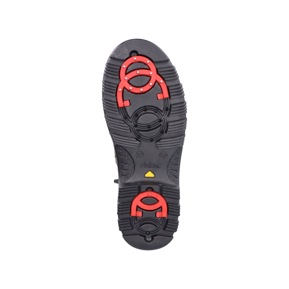 Vinterskolett fra Rieker i semsket skinnmed vanntett membran, har snøring over vrist samt en glidelås på innside av ankel, varmtfôret innvendig samt dekksåle, kraftig yttersåle som gir god demping og et godt grep. Utfellbare brodder.