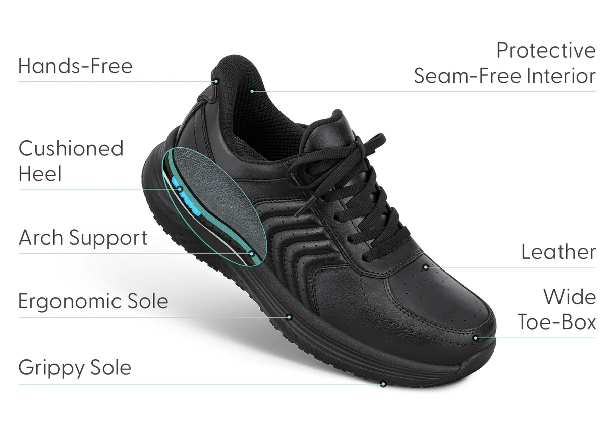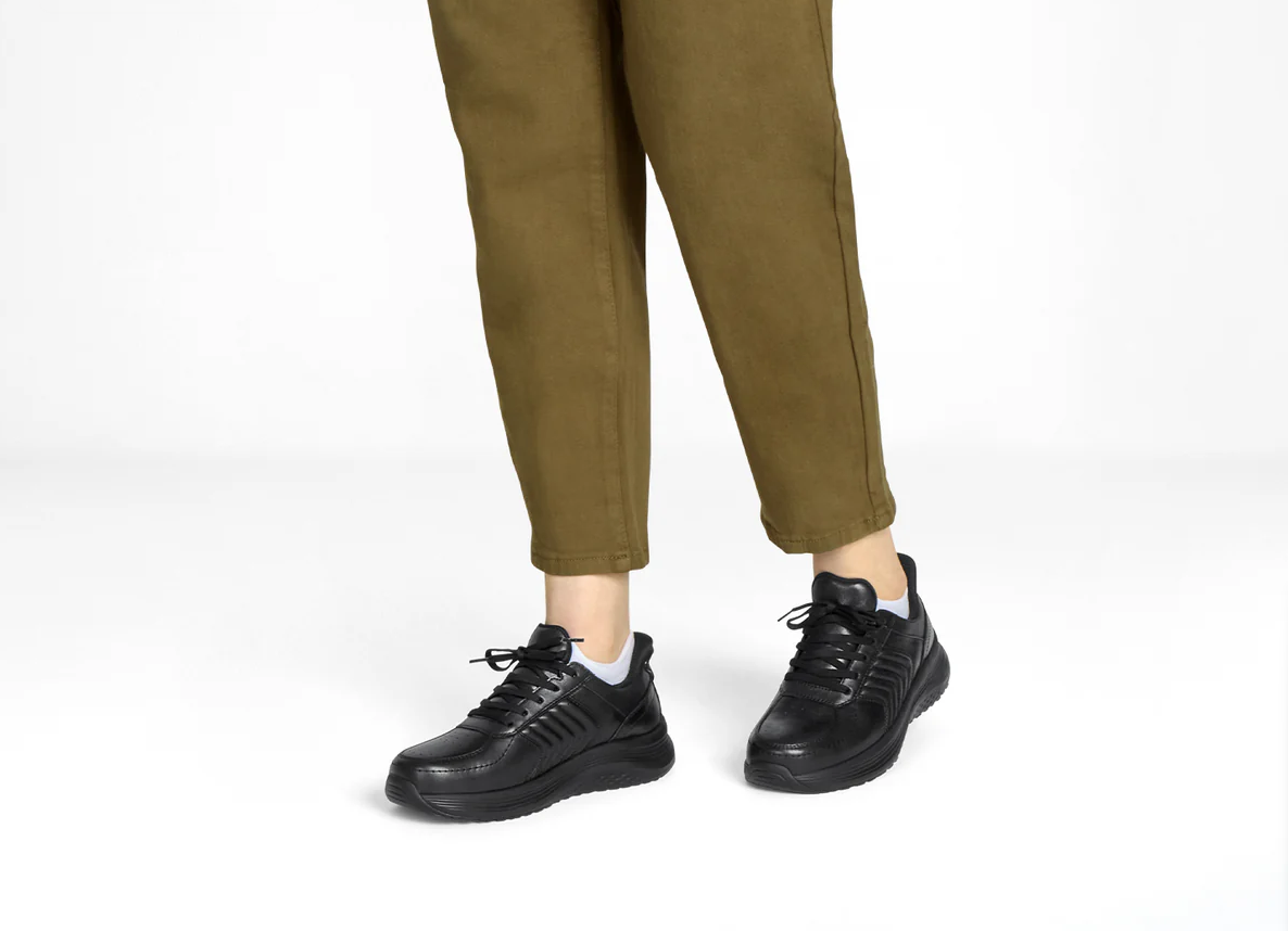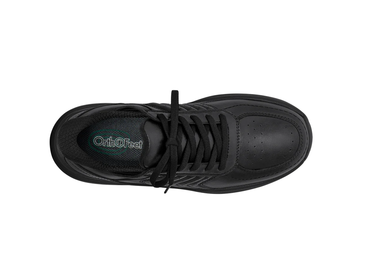 Raom fra Orthofeet i glatt skinn har snøring over vrist og slip on hælkappe slik at man kan tråkke rett inn. Sko fra OrthoFeet er utviklet av fotterapauter og biomekaniske ingeniører. Skoene har ekstra dybde som er godt for blandt annet føtter med hallux valgus eller hovene føtter. Anatomisk støtte under fotbuen forhindrer overpronasjon. Fotbuestøtten er justerbar med den inkluderte "arch boosteren". Sålene er sømfrie og mykt polstrede som forhindrer irritasjon. Yttersålen gir godt grep. Stor i størrelsen.
