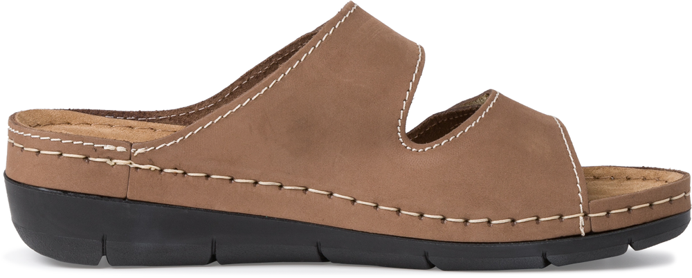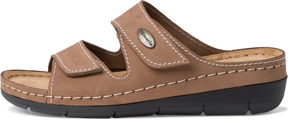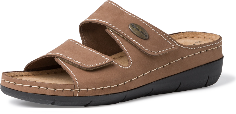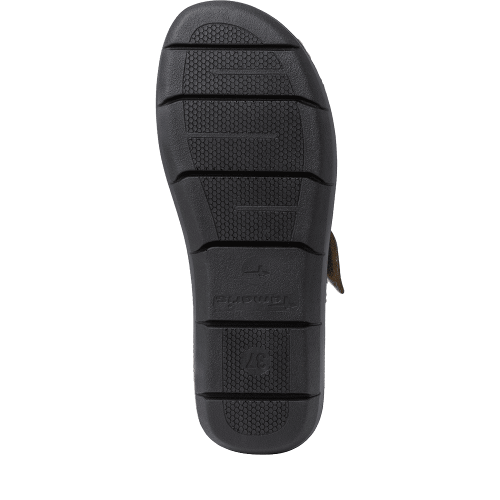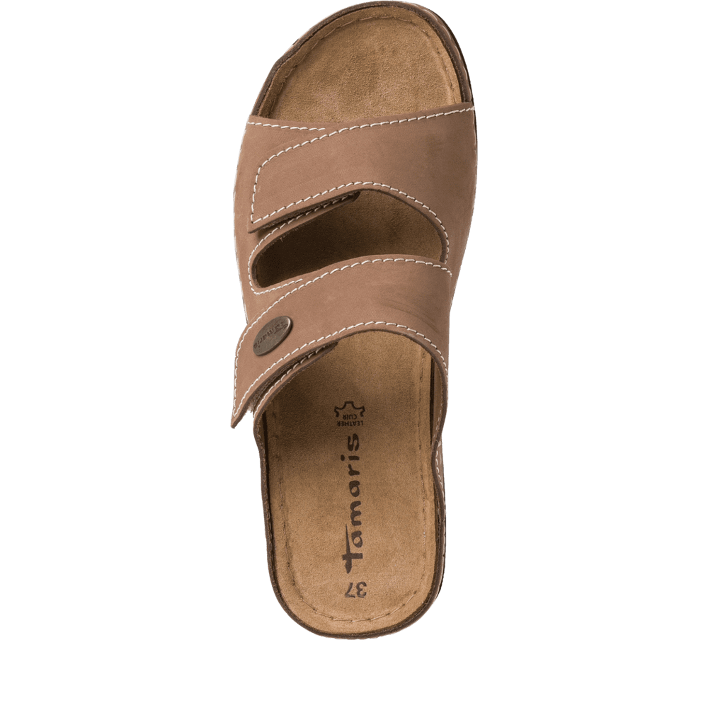 Komfortabel sandal i skinn fra Tamaris med to borrelås over vrist. og myk dekksåle i semsket skinn. Hælhøyden er på 35 mm.
