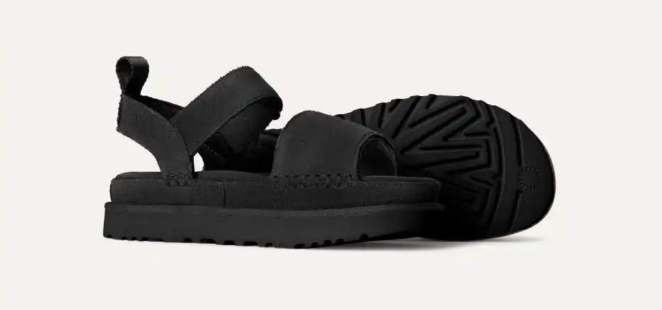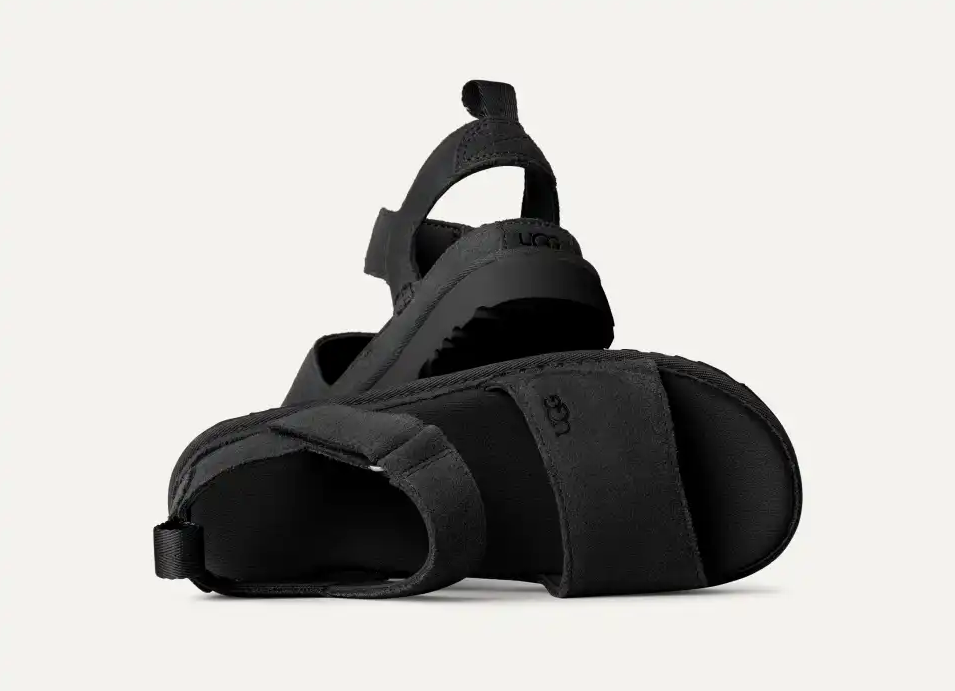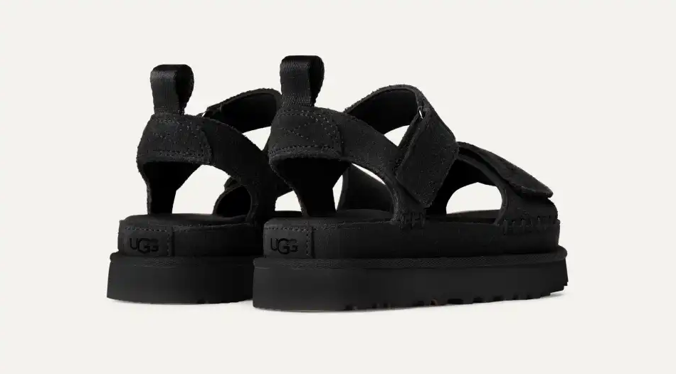 Sandal fra merket Ugg i modellen Goldenstar i semsket skinn, har to justerbare borrelås, myk og kraftig dekksåle samt platå yttersåle som gir god demping.