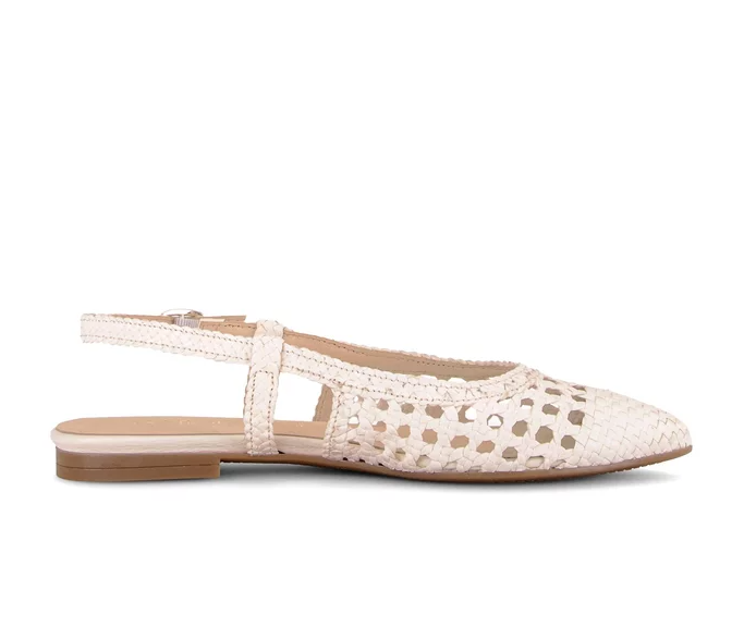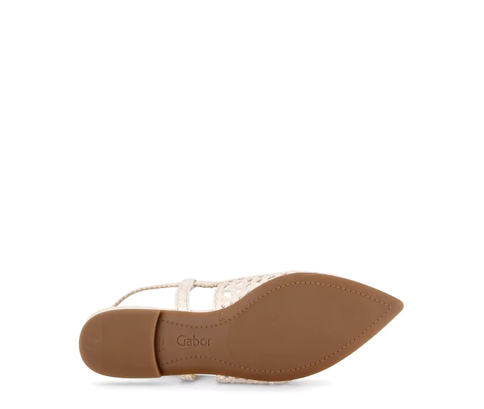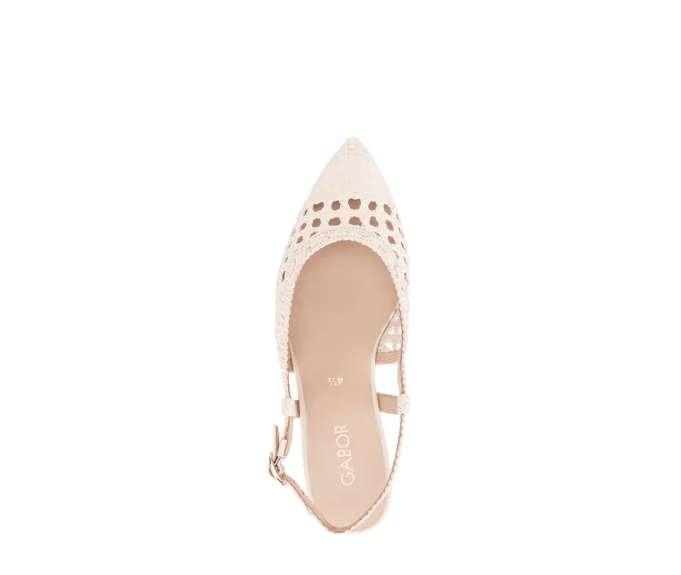 Pensko med sling-back reim i kremfarget flettet skinn. Lav hæl på 1,5 cm og spiss tå. Bred passform (G-lest).