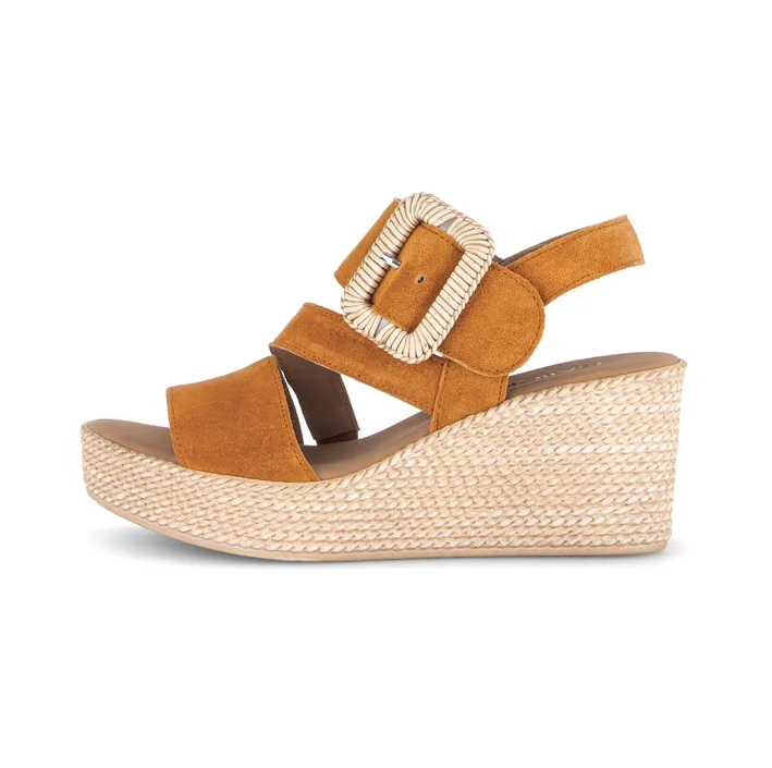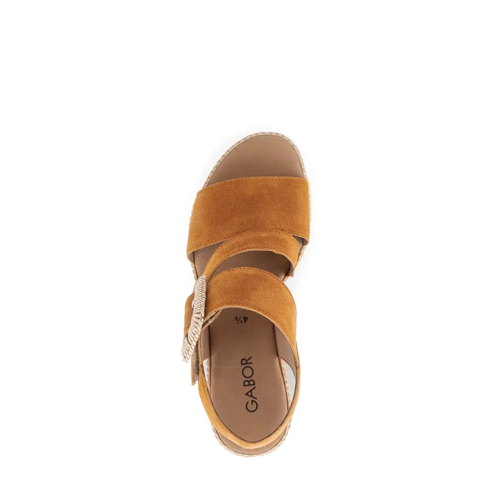 Kilehælssanaler fra Gabor i mockaskinn, fôret med skinn. Kilehælen er 7,5 cm høy. Normal bredde (F-lest), men med ekstra rom i tåboksen.