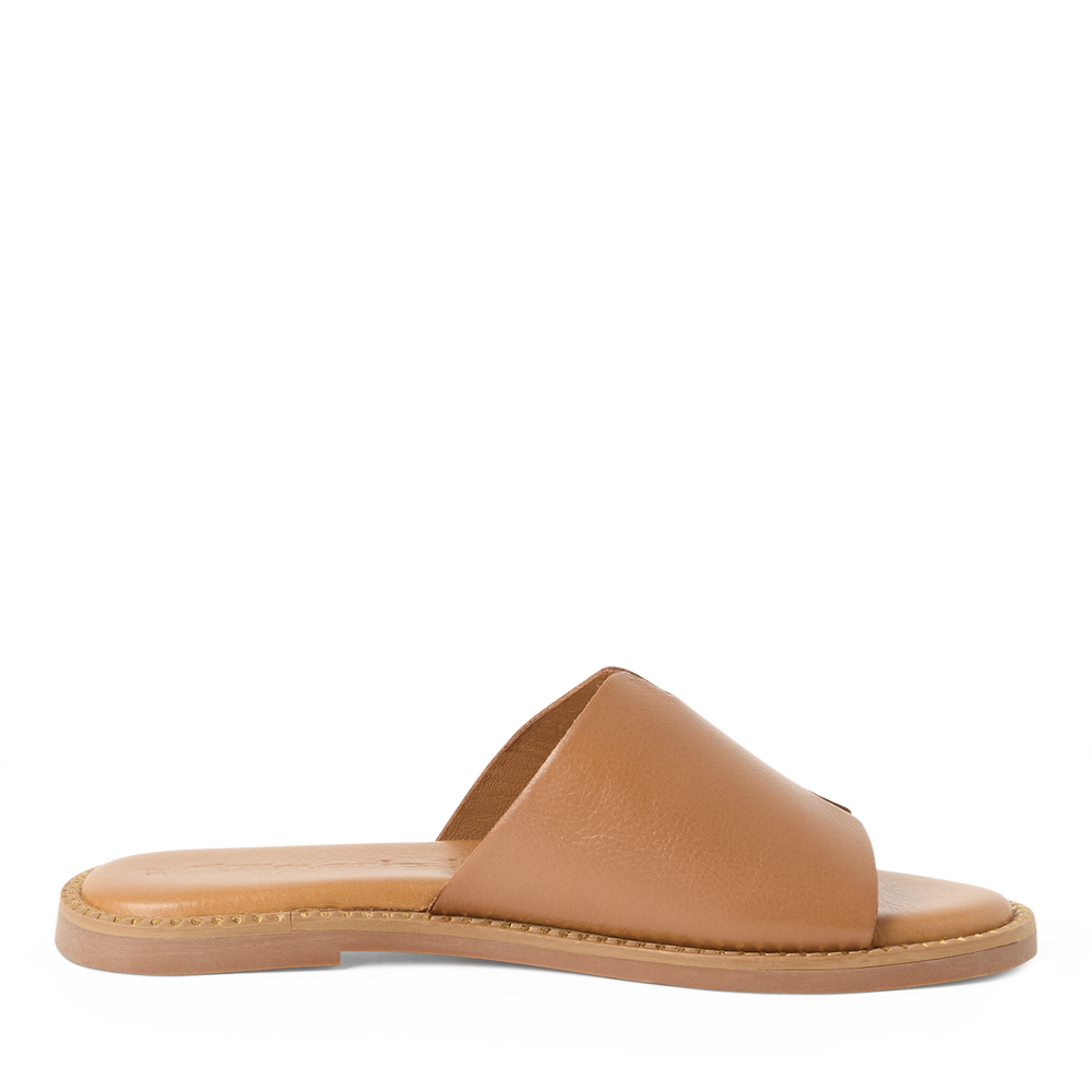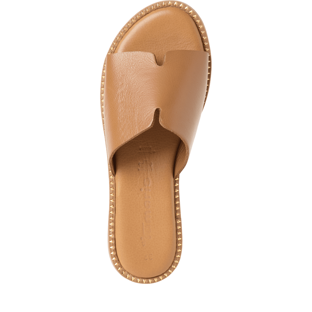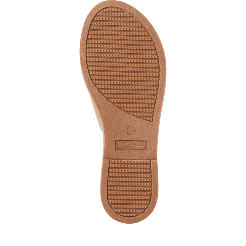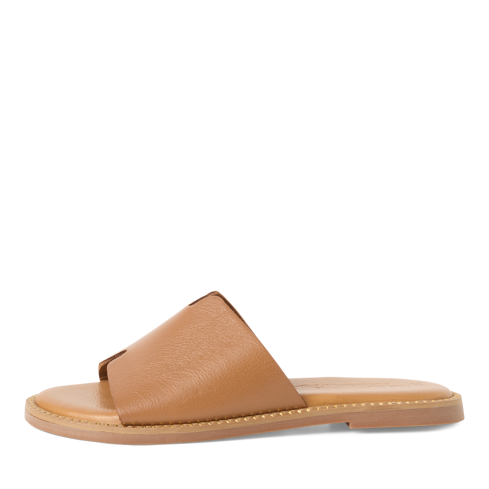 Sandaler fra Tamaris i cognac-farget skinn. Myk dekksåle i skinn som formes etter foten. Lav hæl på 1 cm.