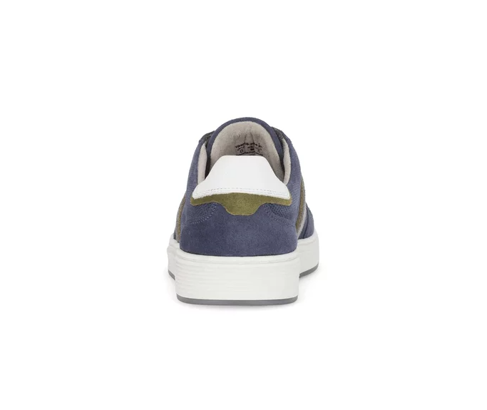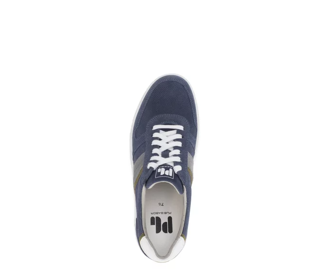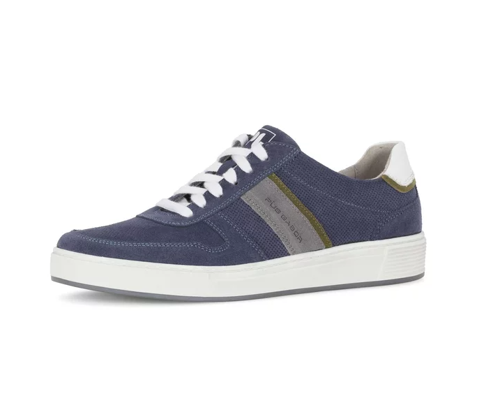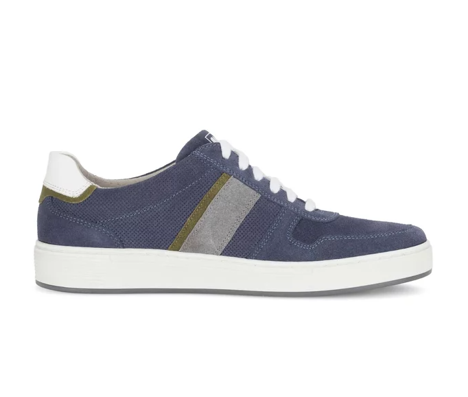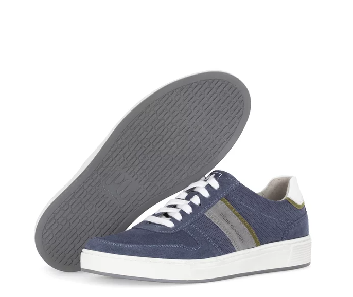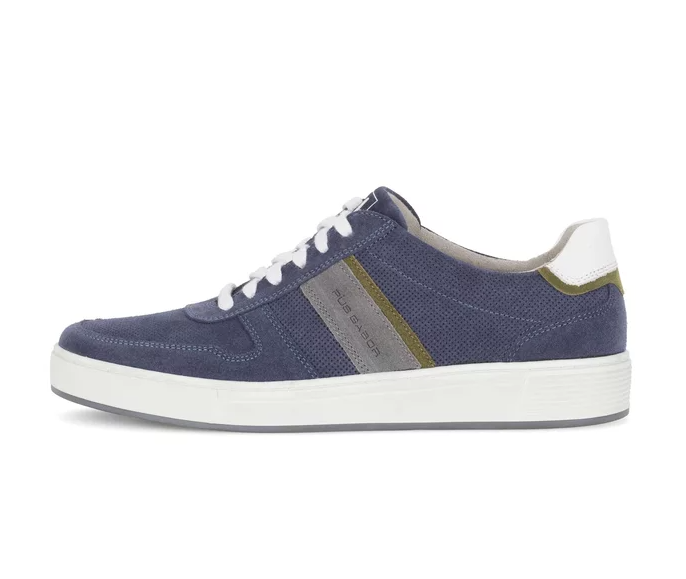 Sneakers fra Pius Gabor i blått semsket skinn. Med grå og grønn spripe. Uttagbar innersåle og snøring over vrist.