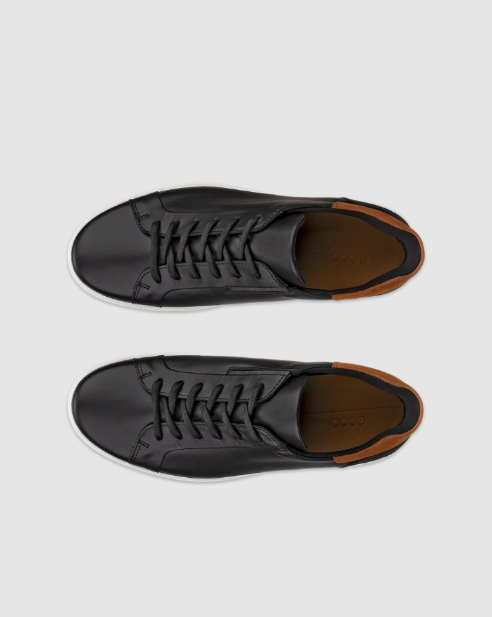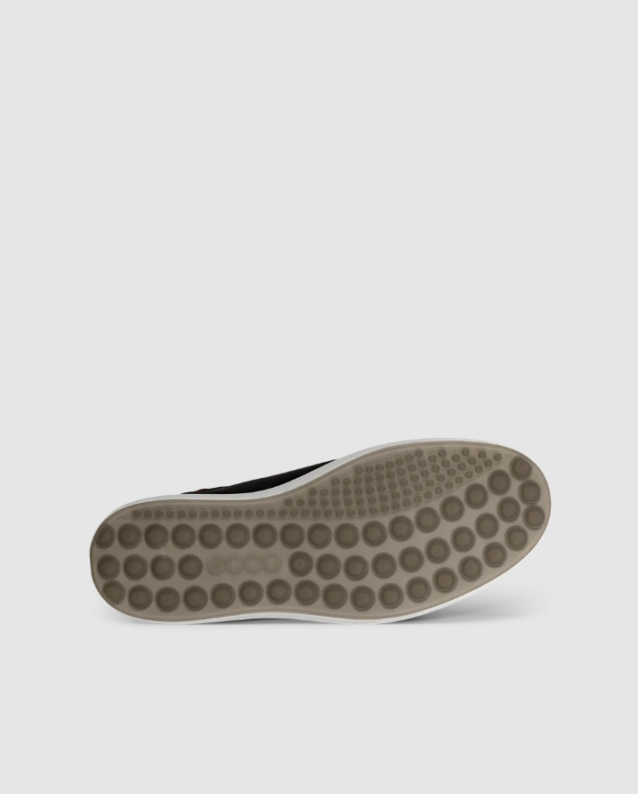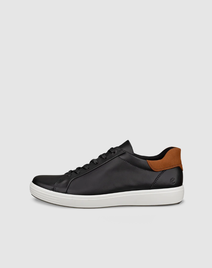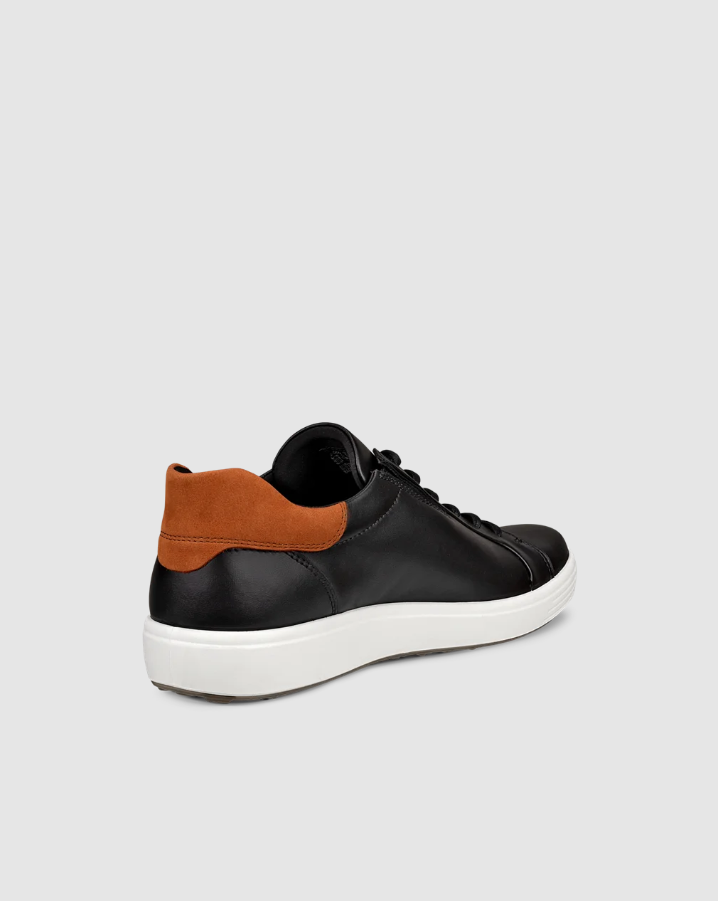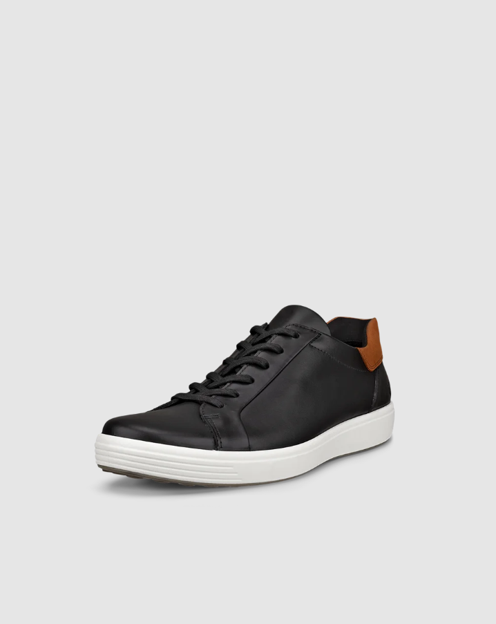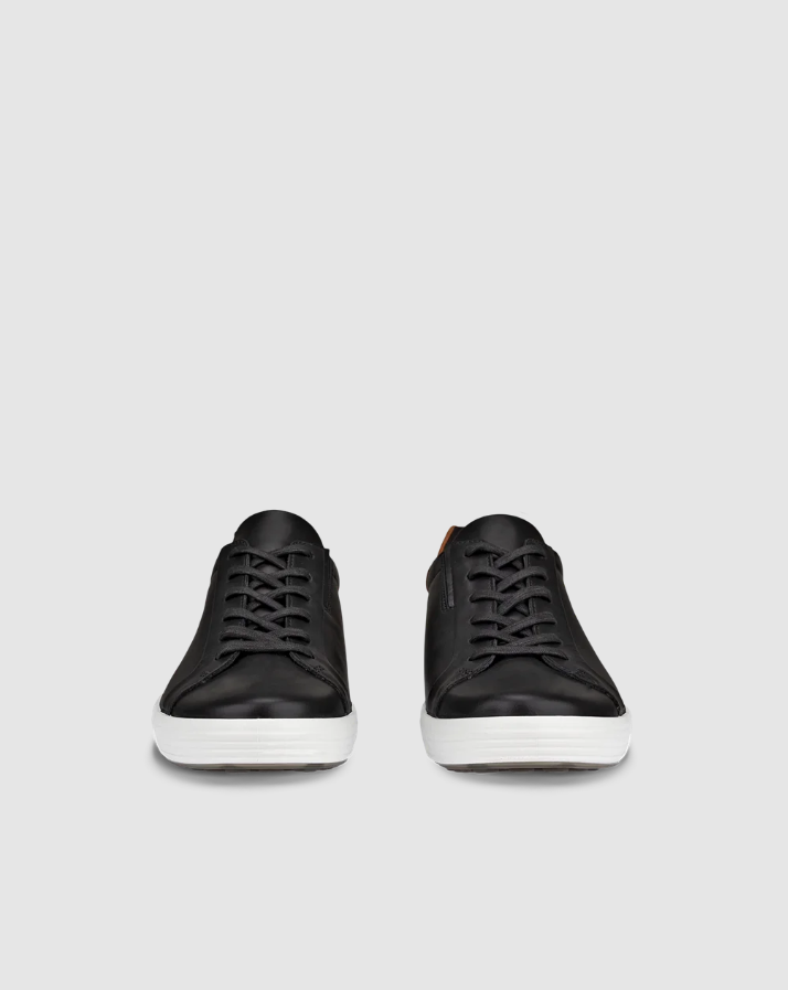Komfortable sneakers i sort skinn fra ECCO i modellen Soft 7. I tillegg til snøring over vrist har de strikk på siden som gjør dem ekstra lette å ta på. Har uttakbar innersåle og platå yttersåle i sort gummi som gir god demping.