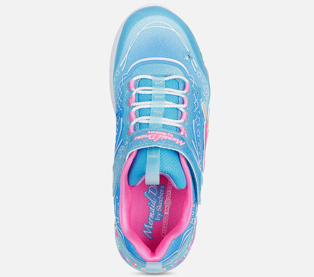 Blinkesko fra Skechers med havfruemotiv. Justerbar rem over vrist og strikklisser. Myk innersåle, kraftig yttersåle EVA som gir god demping.