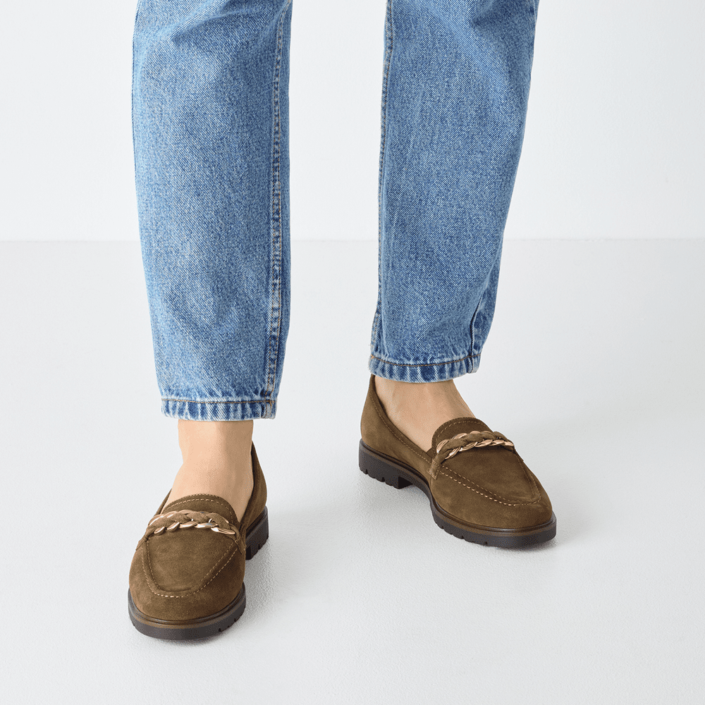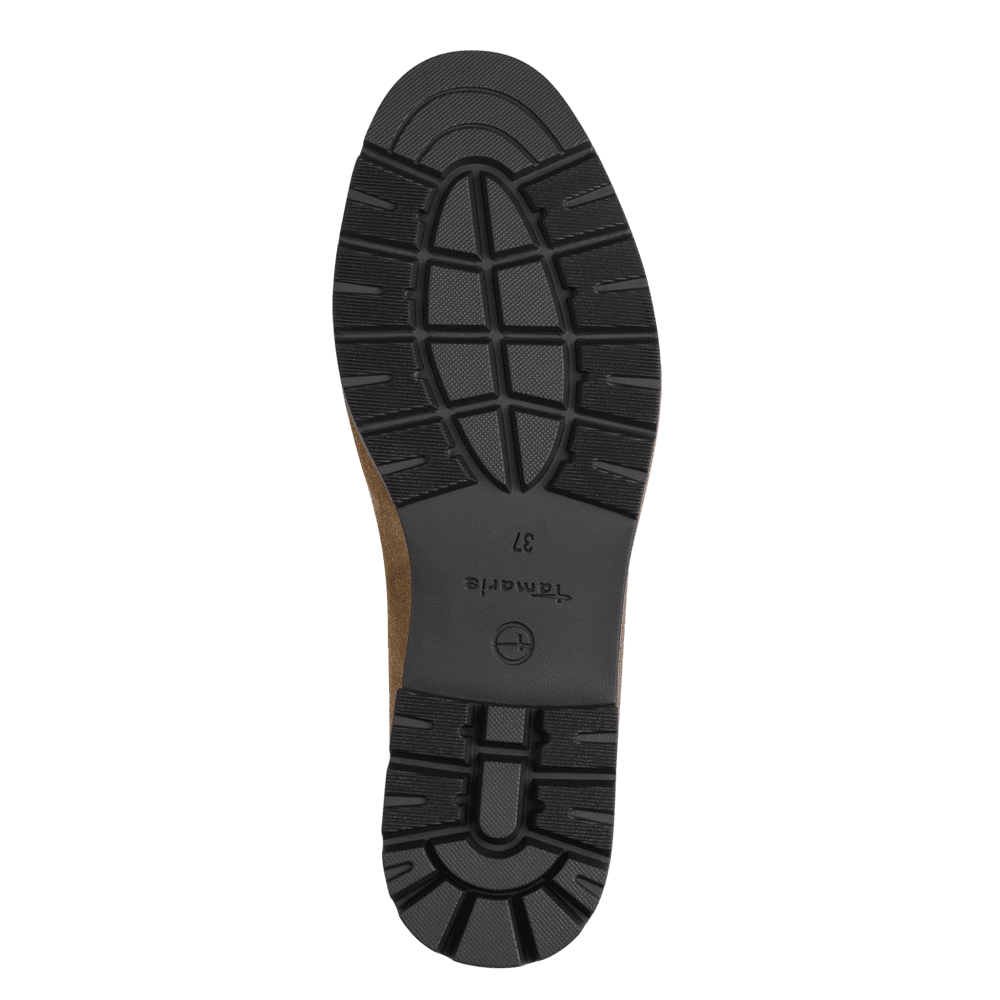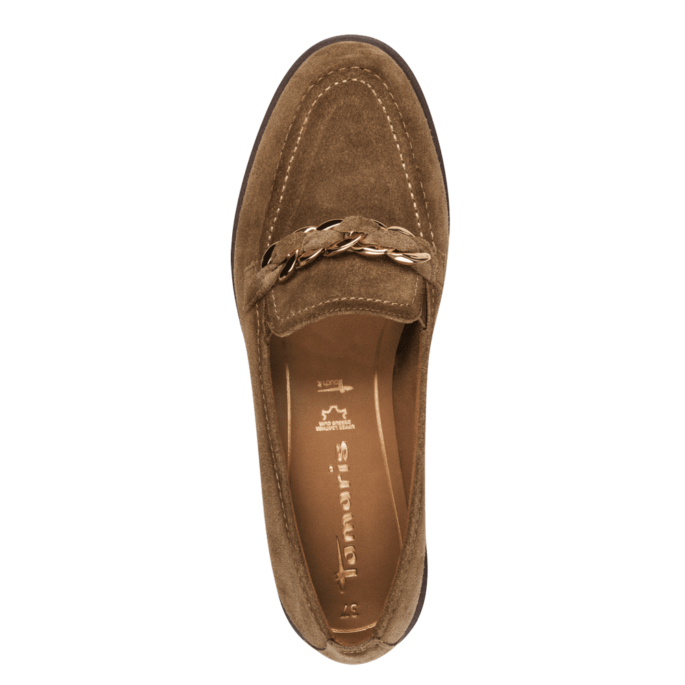 Loafers fra Tamaris i semsket skinn med rund skotupp, pynt over vrist og 2,5 cm lav hæl. Dekksåle i lær som formes etter foten.