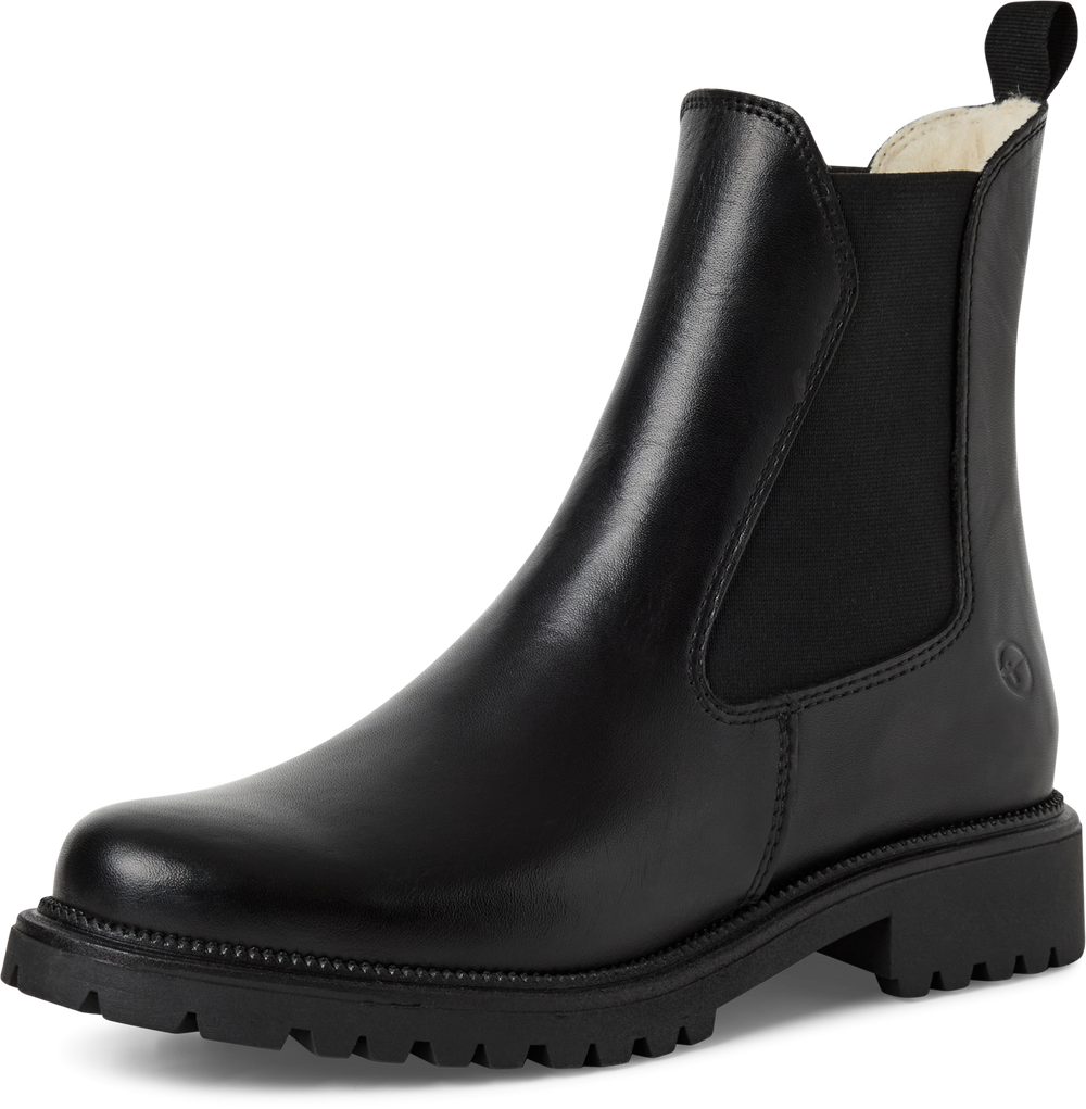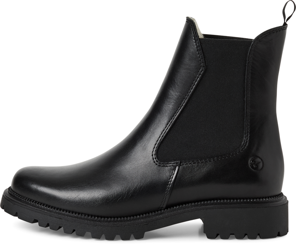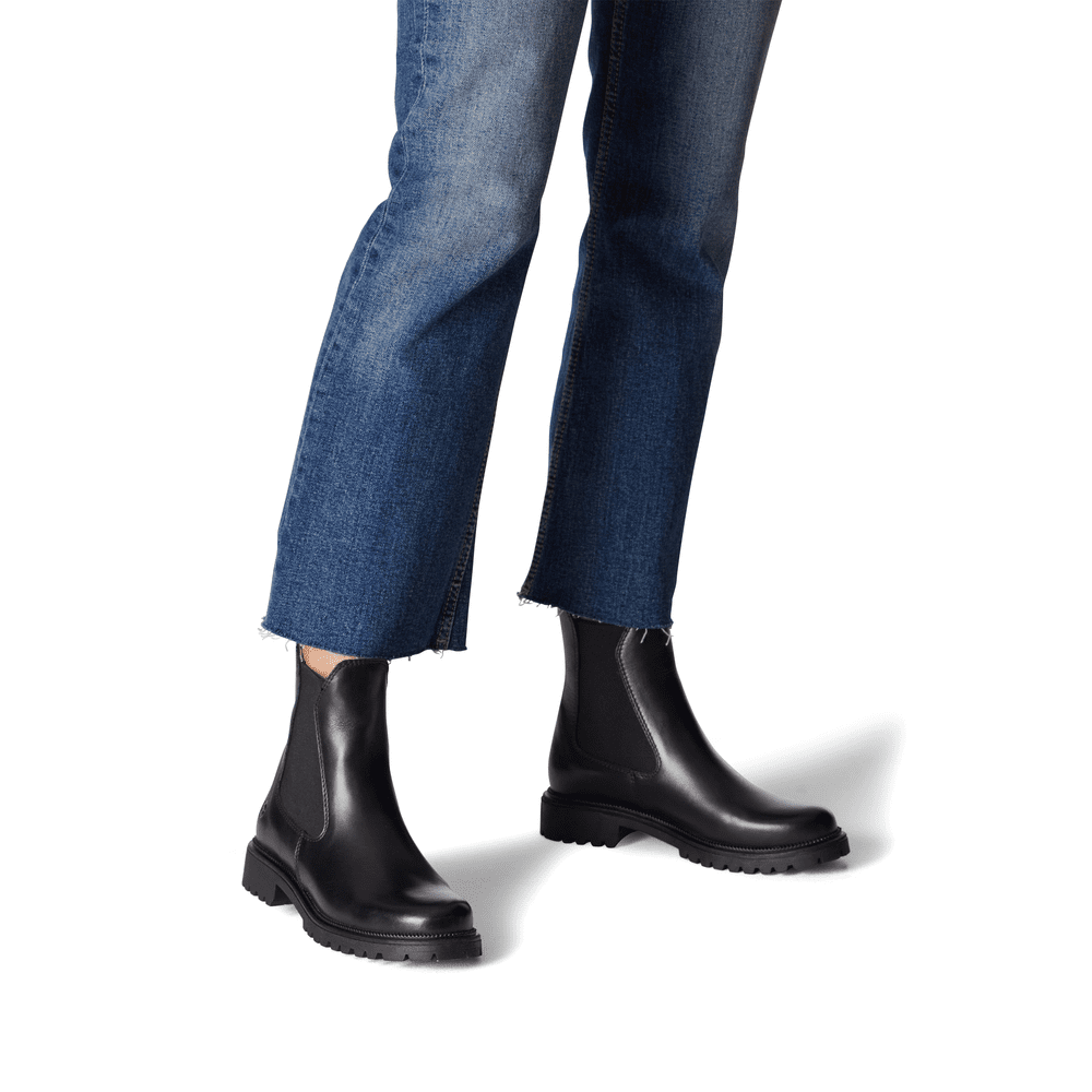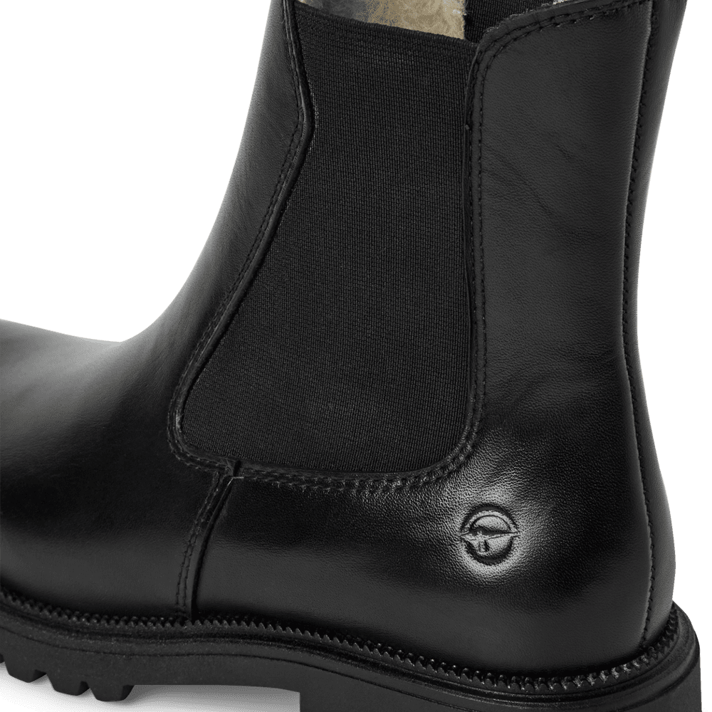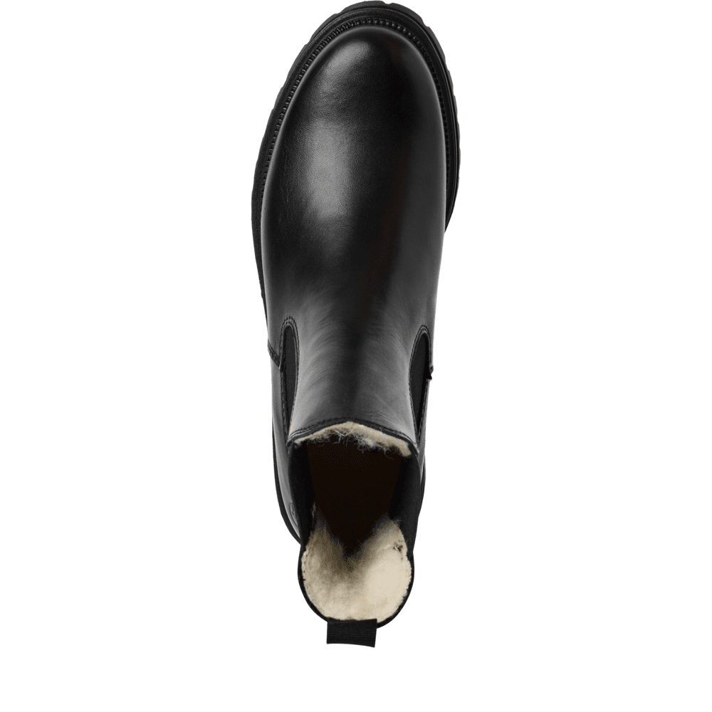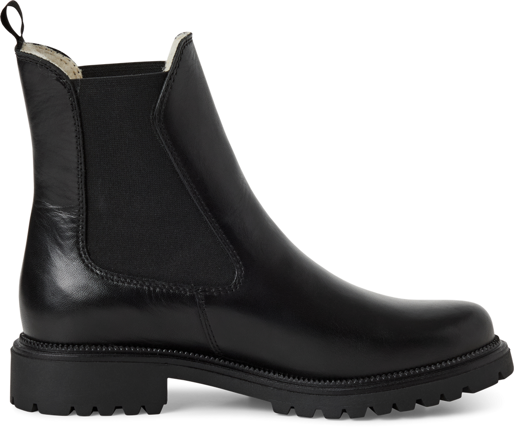 Chelsea boots i sort glatt skinn med tynt fôr, rund tå og 30mm høy hæl. Elastiske strikkpaneler i sidene og hempe bak. Modellen er normal i størrelsen.