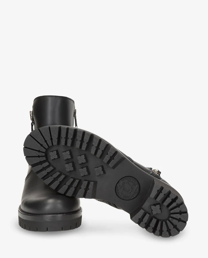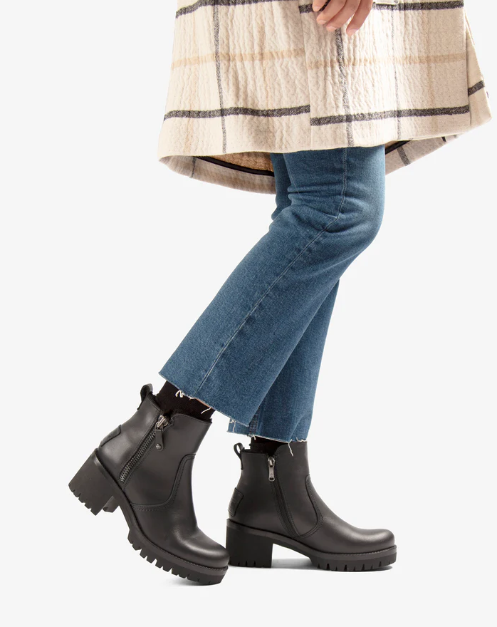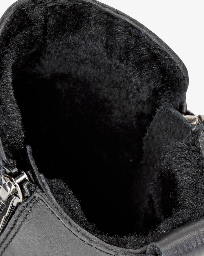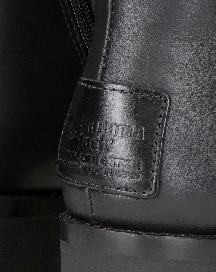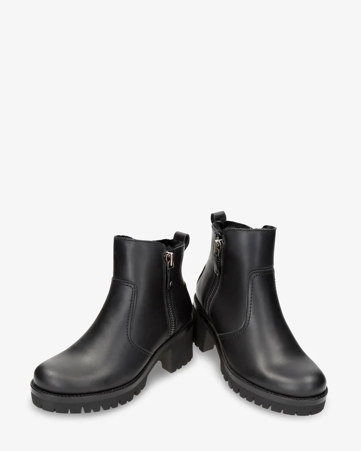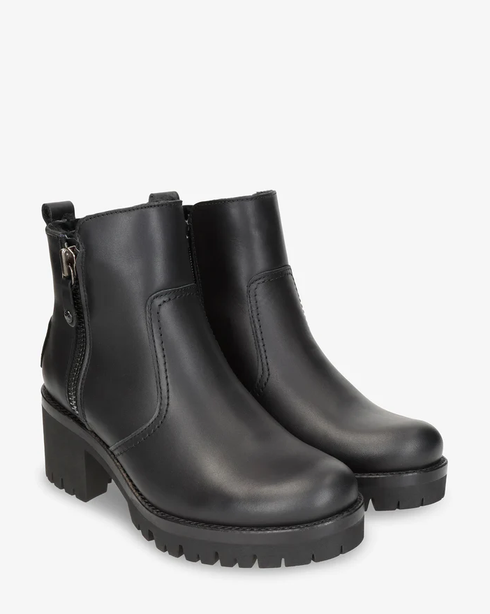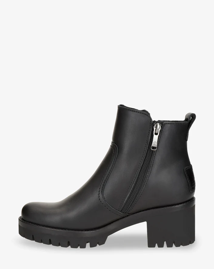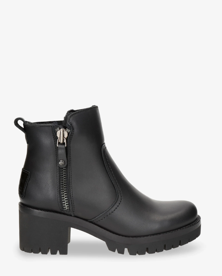 Vintersko fra Panama Jack med 7,5 cm høy hæl og glidelås i sidene. Sort glatt skinn utvendig og fôr i saueskinn. Uttagbar anatomisk innesåle. Yttersåle i naturgummi gir godt grep. Laget i Spania.