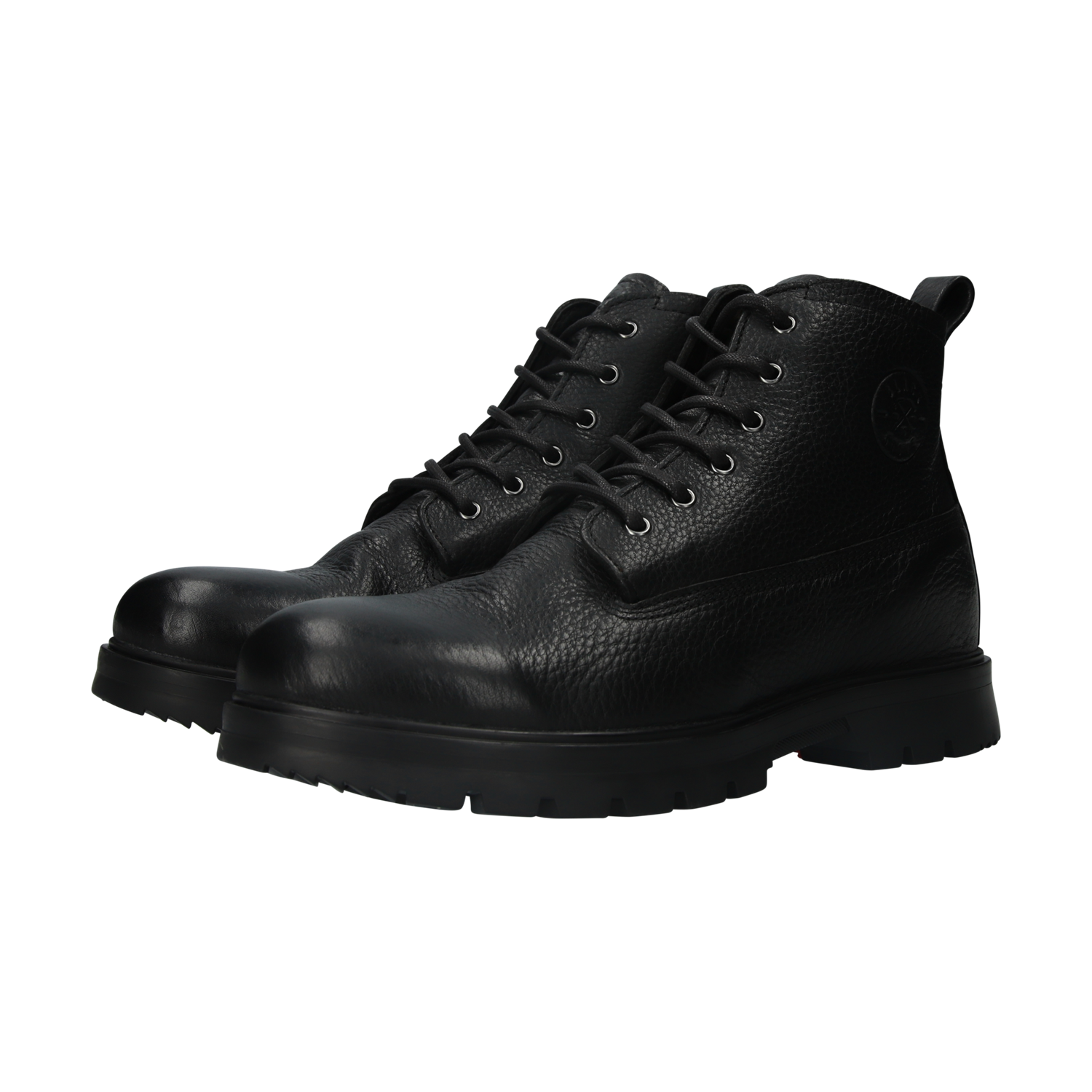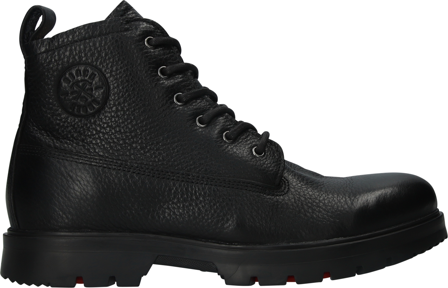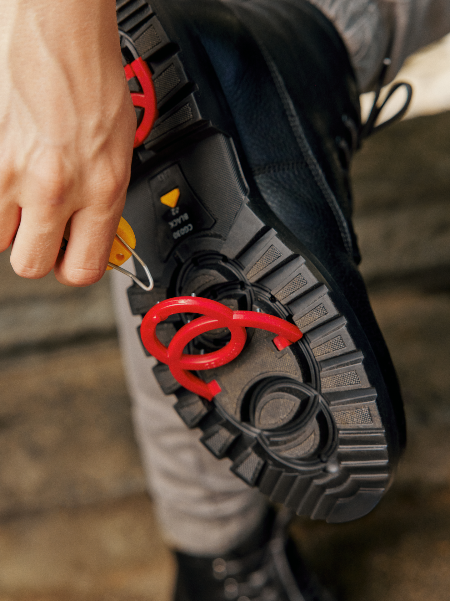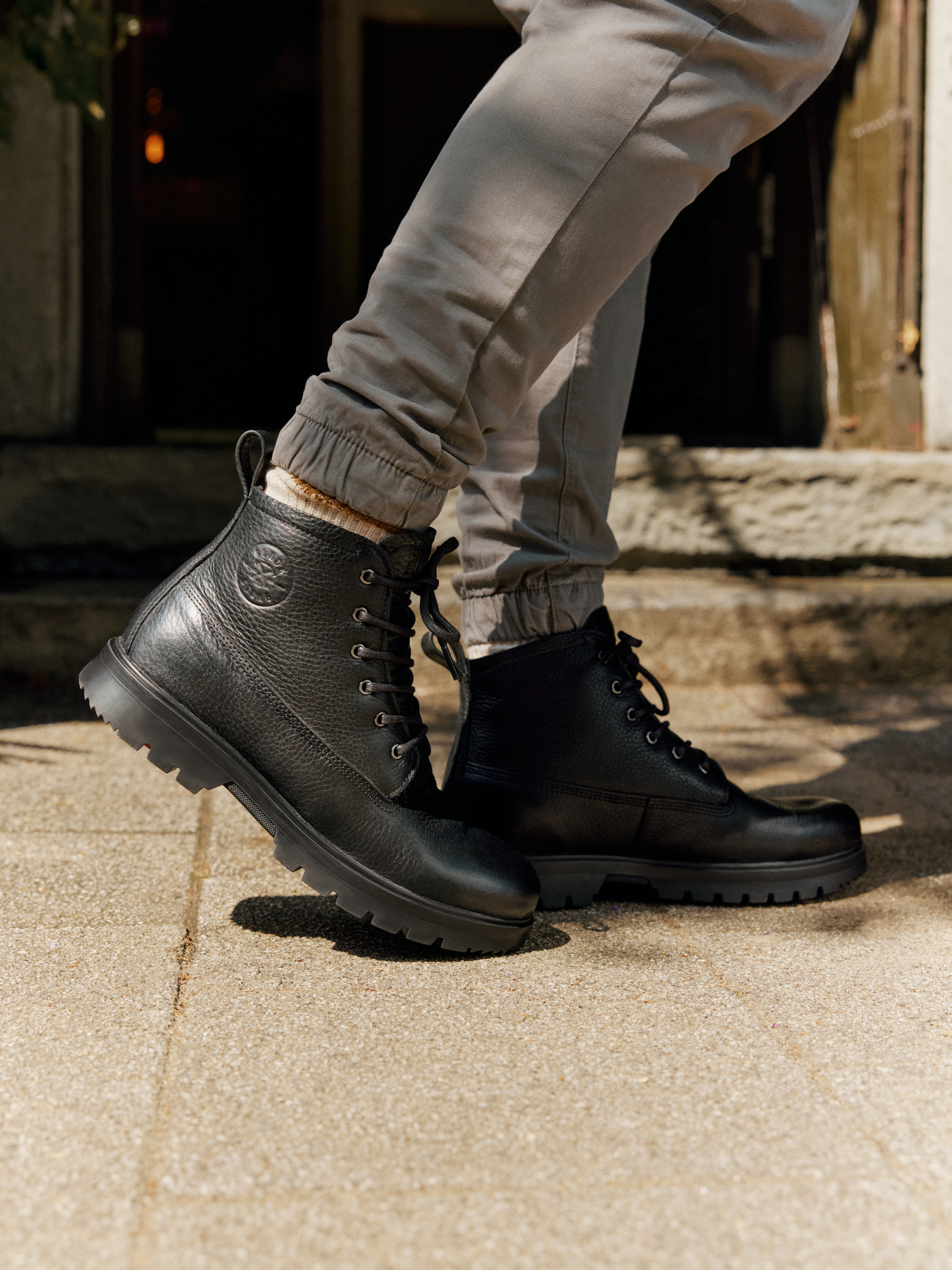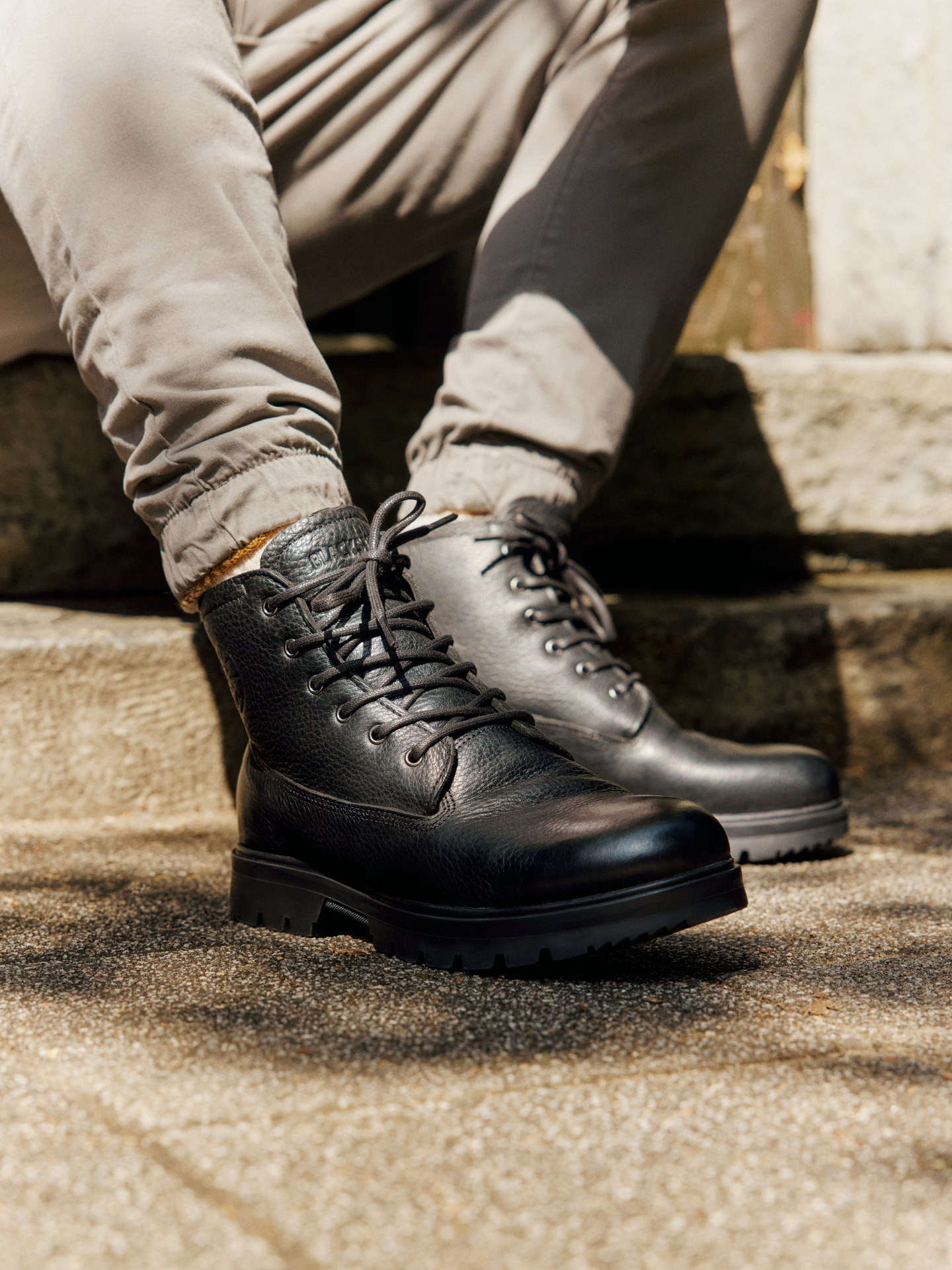Vintersko fra blackstone i sort skinn. Fôret med saueskinn. Uttagbar innersåle og yttersåle i gummi. Utfellbare AL.PI. brodder.