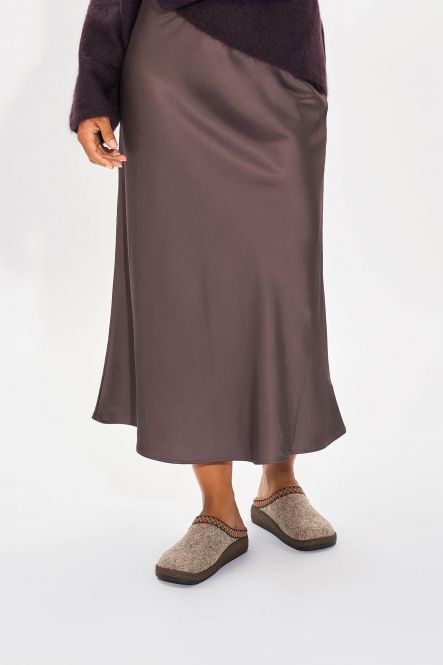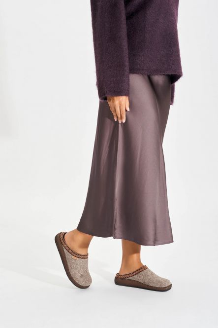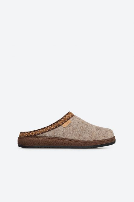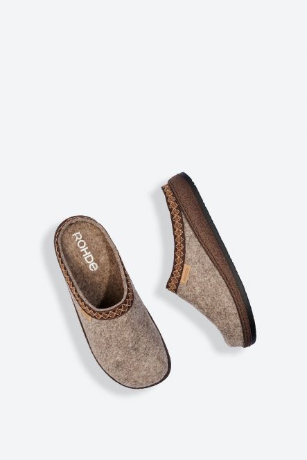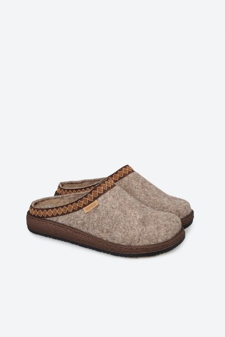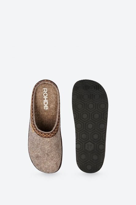 Tøfler i filt med fin dekorativ kant. Myk uttagbar fotseng. Yttersåle i PU som gir god demping.