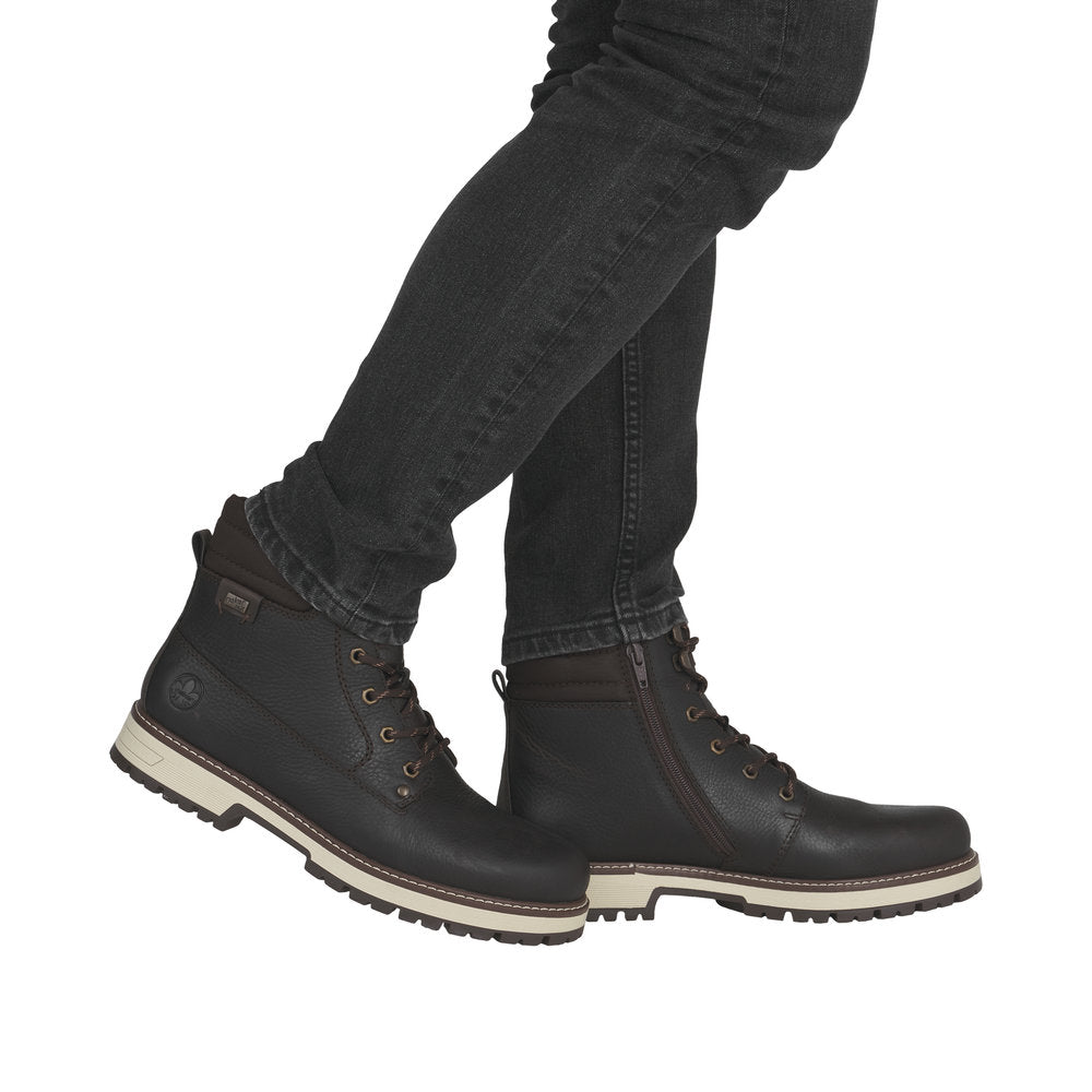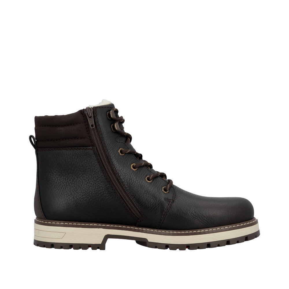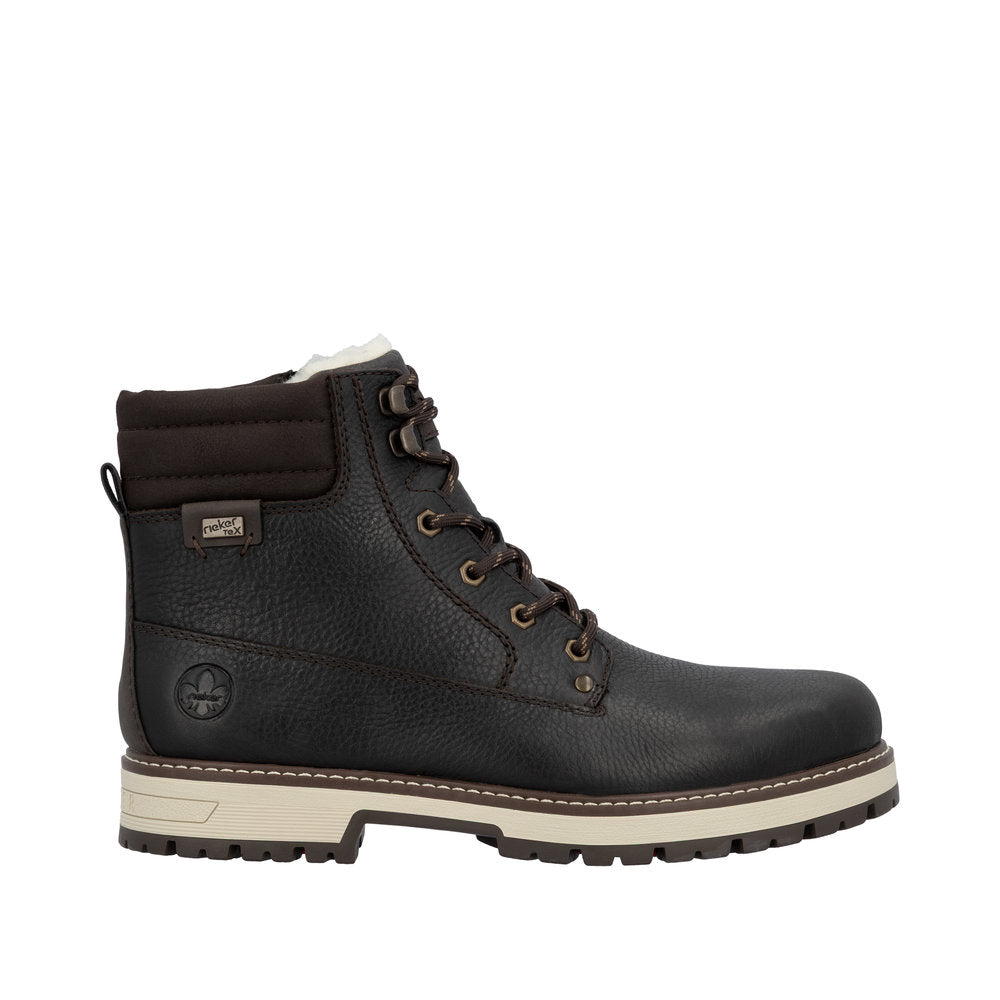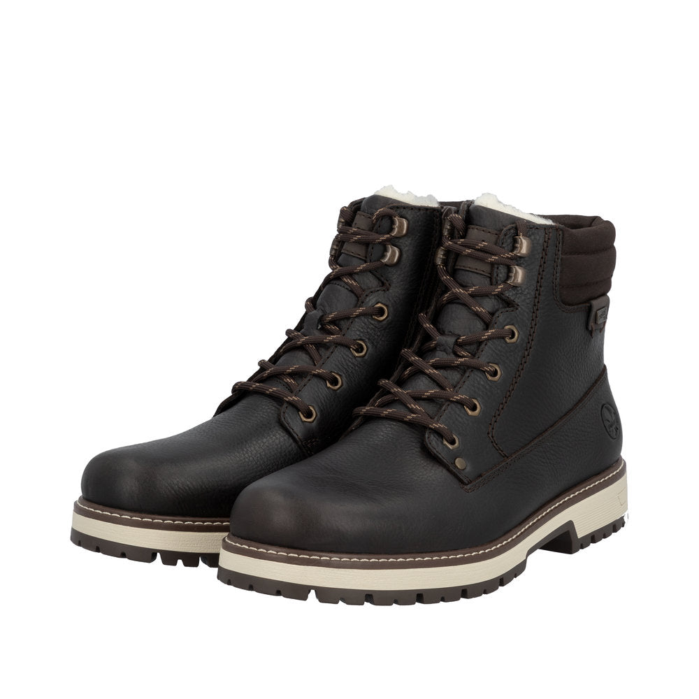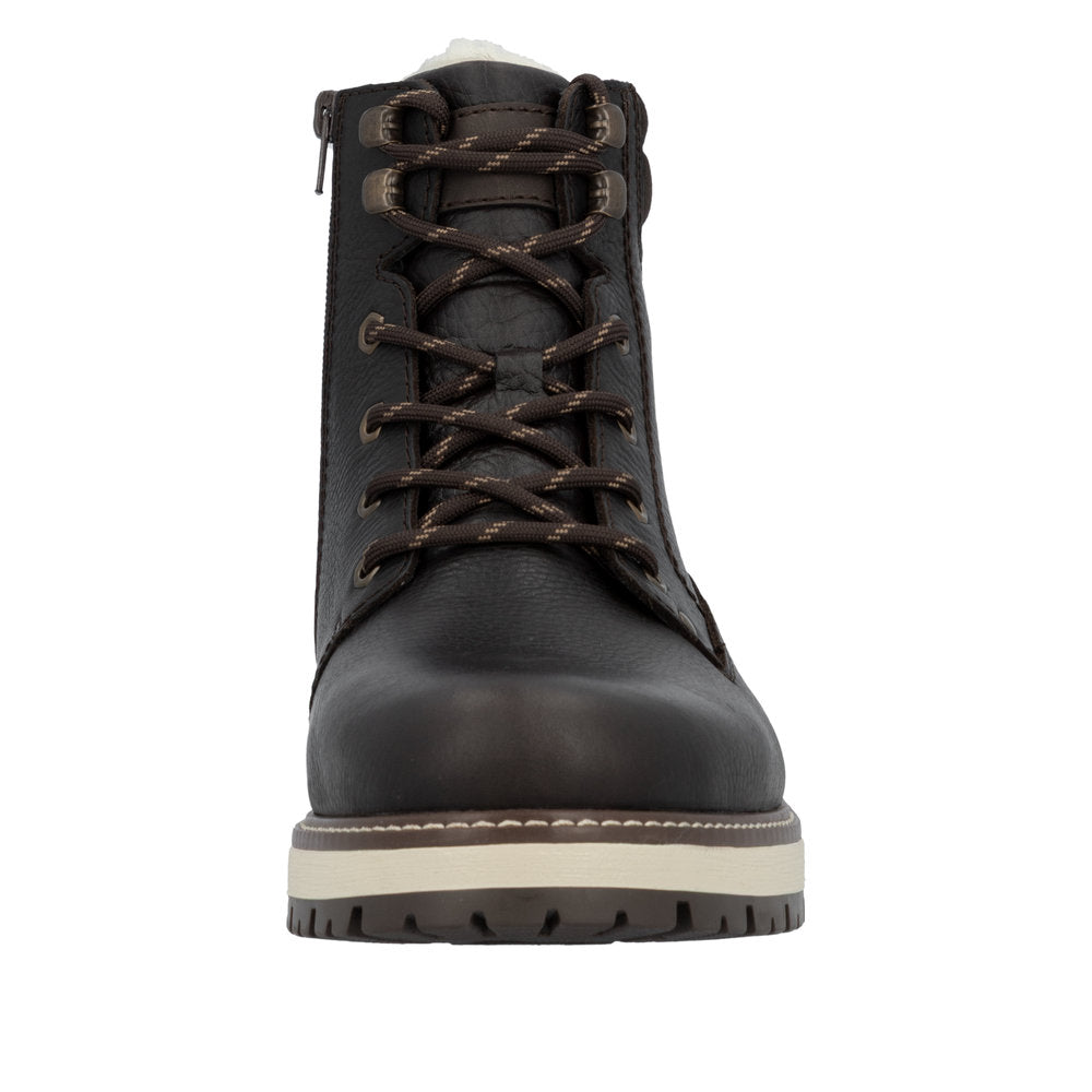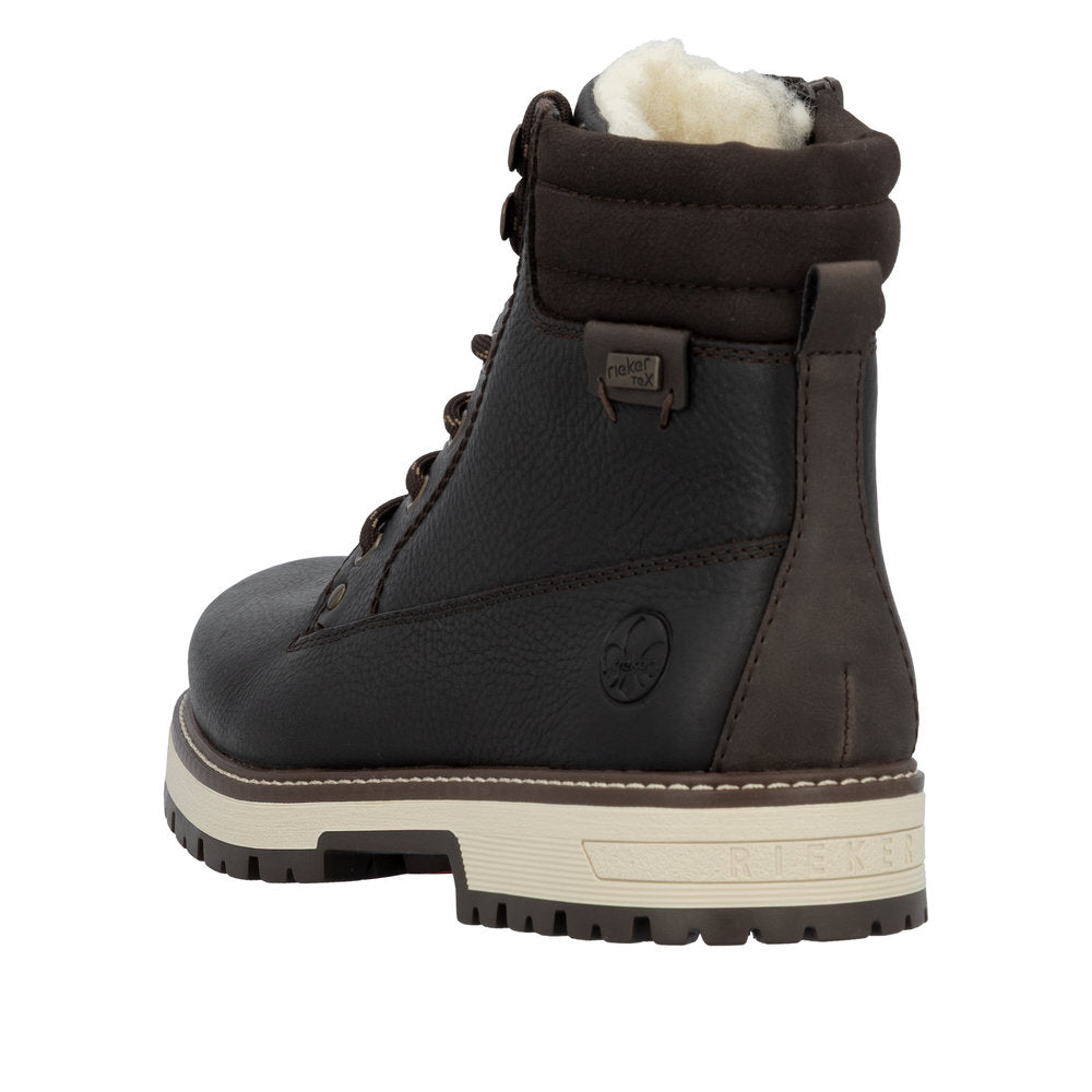 Vintersko fra Rieker i skinn med utfellbare brodder, snøring over vrist og glidelås i siden. Skoene er fôret med varm ull. Vannavvisende membran holder føttene tørre.