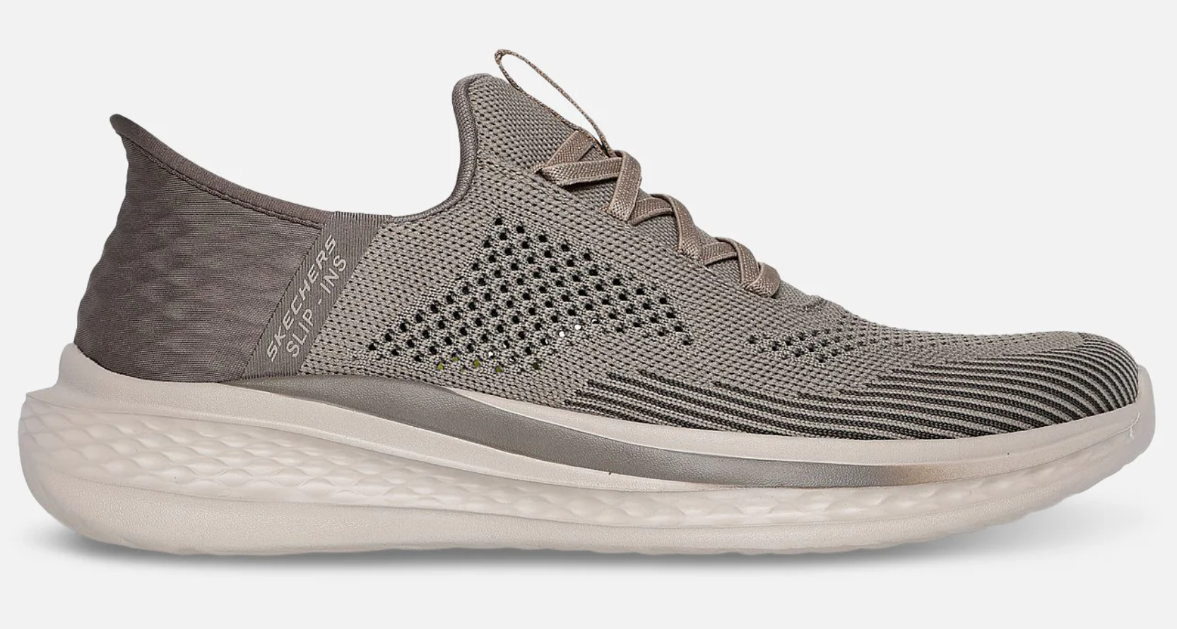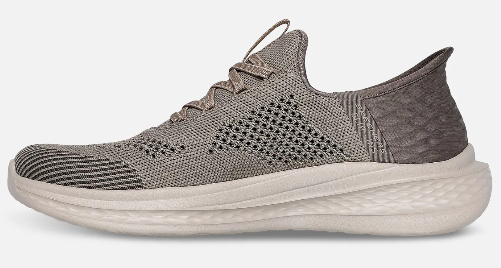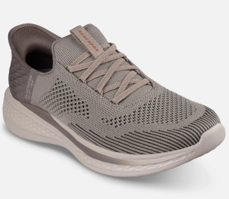 Slip-in sko fra Skechers med strikket overdel. Stiv yttersåle med myk polstring innevndig og striklisser gjør at du kan tråke rett ned i skoen. Innersåle med air-cooled memory foam former seg etter foten og ekstra støtte under fotbuen. Modellen er relaxed-fit, med ekstra plass på forfoten.