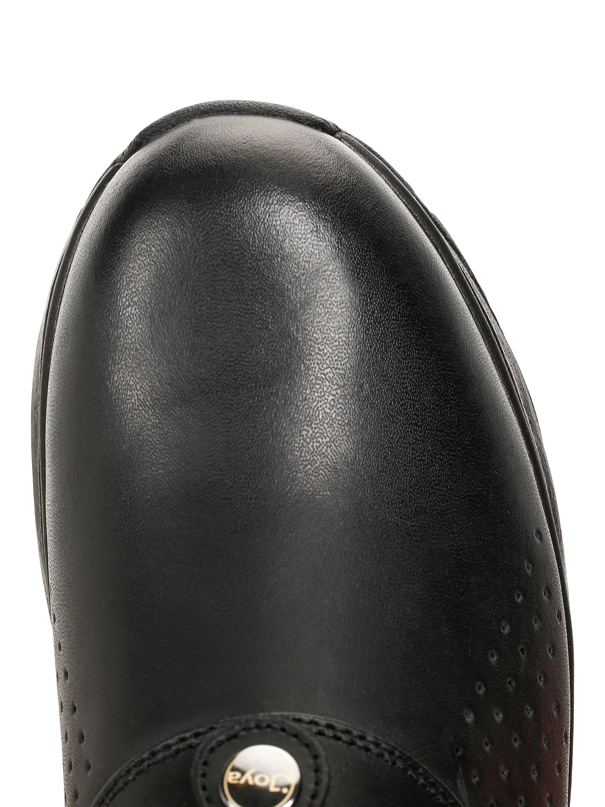 Slip-on sko fra merket Joya i sort skinn med Soft-Pro, utrolig behagelig sko man kan gå lenge i uten å få vondt i beina, fôret med skinn, en justervar borrelås bak hælkappe, myk polstret innersåle, myk og elastisk mellomsåle, yttersåle i gummi med slip resistant som gir et godt grep.