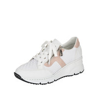 Sneakers fra Rieker i skinn/imitert skinn med detaljer i beige, har snøring over vrist samt glidelås på ytterside. Uttakbar innersåle, kraftig yttersåle som er oppbygd og gir god demping.